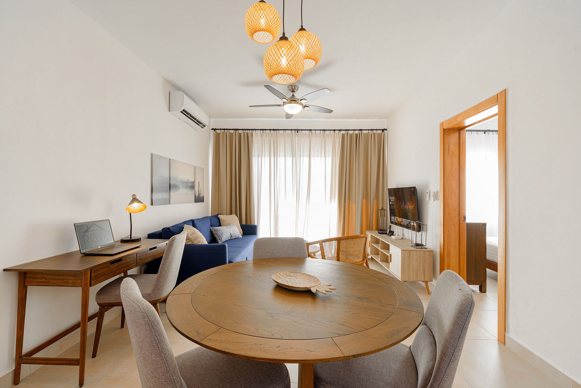 En la sala, un sofá cama adicional brinda espacio para huéspedes adicionales, mientras que la televisión Smart permite disfrutar de películas, series y canales por cable.