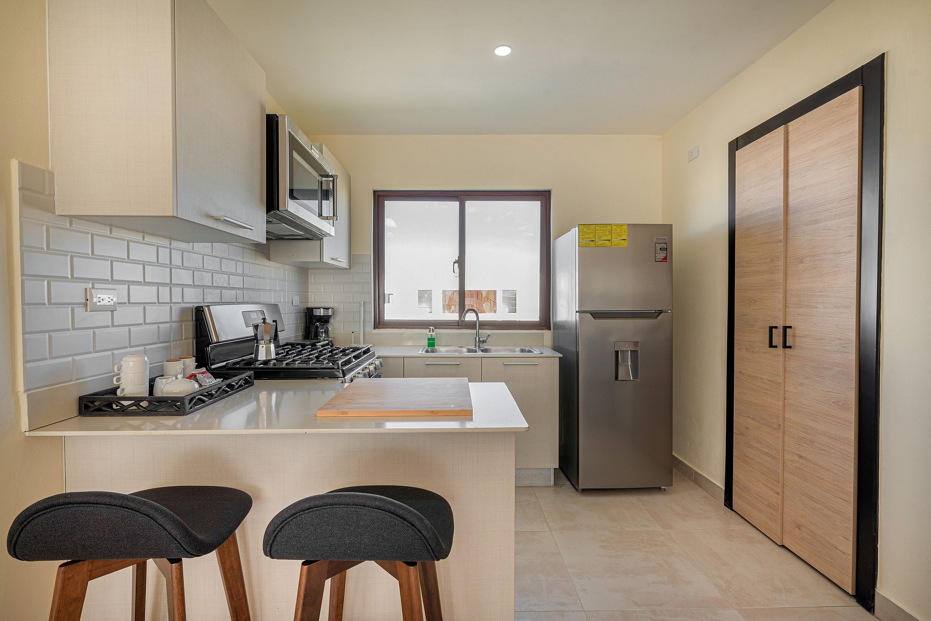 La habitación principal ofrece una lujosa cama Queen, baño privado y un amplio walking closet. En la sala, un acogedor sofá cama para dos y un práctico medio baño brindan comodidad adicional. La cocina totalmente equipada te permite preparar deliciosas comidas. Este espacio combina elegancia con funcionalidad, creando un ambiente perfecto para tu estancia en Punta Cana.