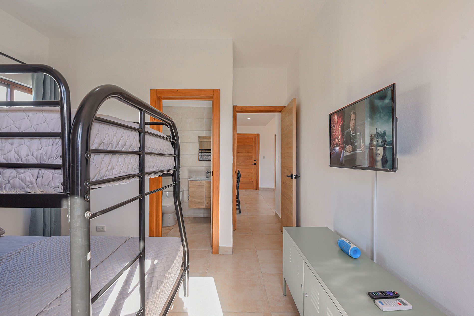 La habitación secundaria es perfecta para amigos o familiares, con una litera doble en el primer nivel y una cama individual en el segundo nivel. La sala de estar es un espacio acogedor con un conveniente medio baño, Smart TV y una cocina completamente equipada que hará las delicias de los amantes de la cocina.