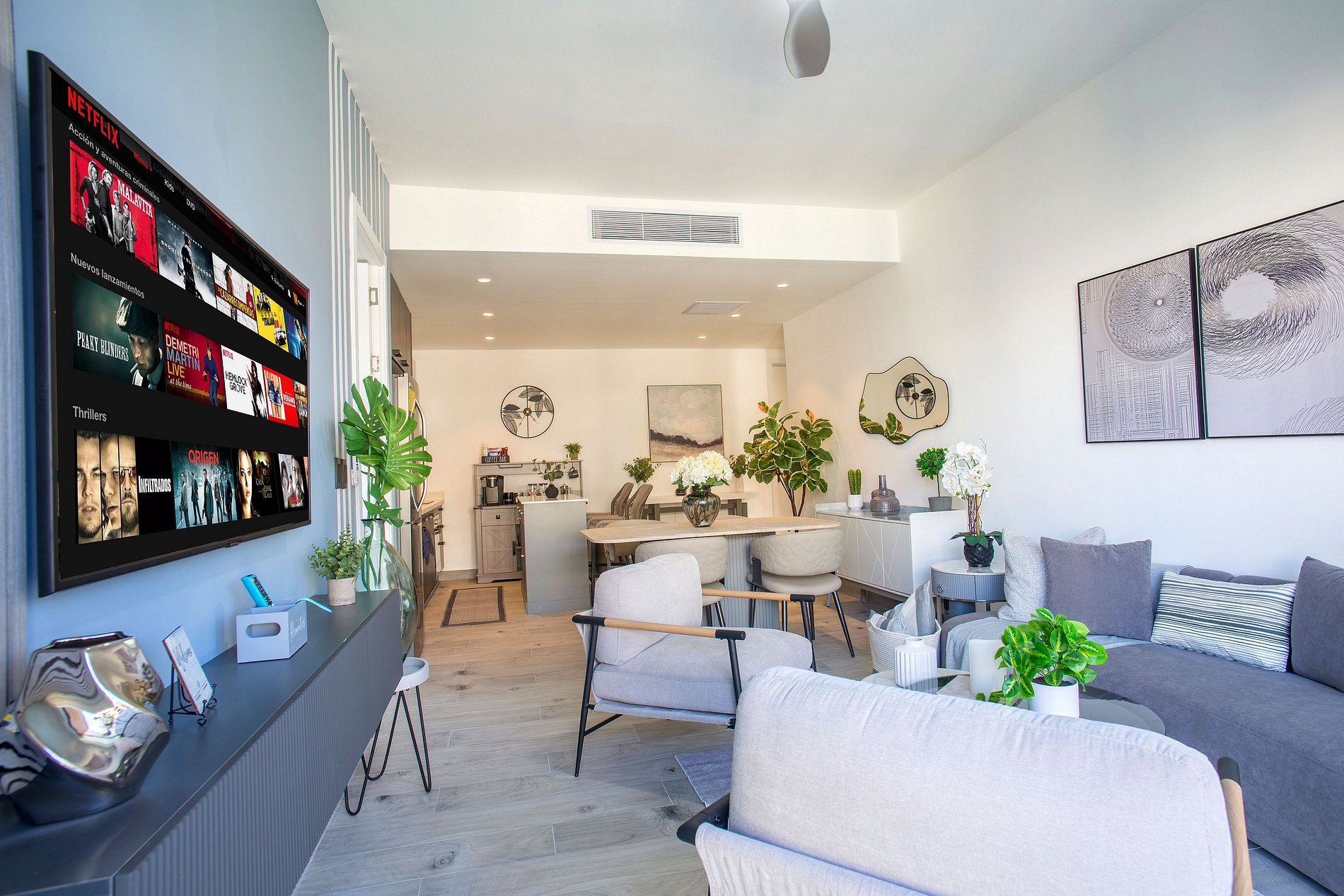 En la sala te espera una televisión Smart para disfrutar de tus series y películas favoritas, un comedor, ideal para momentos inolvidables. La cocina, completamente equipada, invita a explorar tu talento culinario con electrodomésticos de primera. Disfruta de la comodidad de un medio baño en la sala y dos habitaciones, cada una con su propio baño privado. La habitación principal tiene una cama Queen, mientras que la secundaria ofrece dos acogedoras camas Twin, ambas con Smart TV. Desde el balcón, déjate seducir por la impresionante vista a la piscina. La decoración, sofisticada y lujosa, transforma cada rincón en un ambiente cautivador que hará de tu estancia una experiencia verdaderamente memorable.