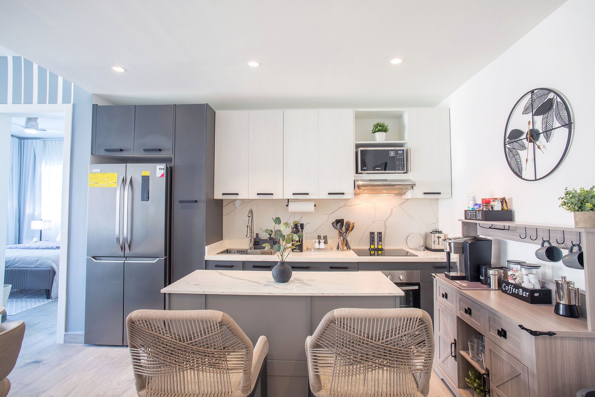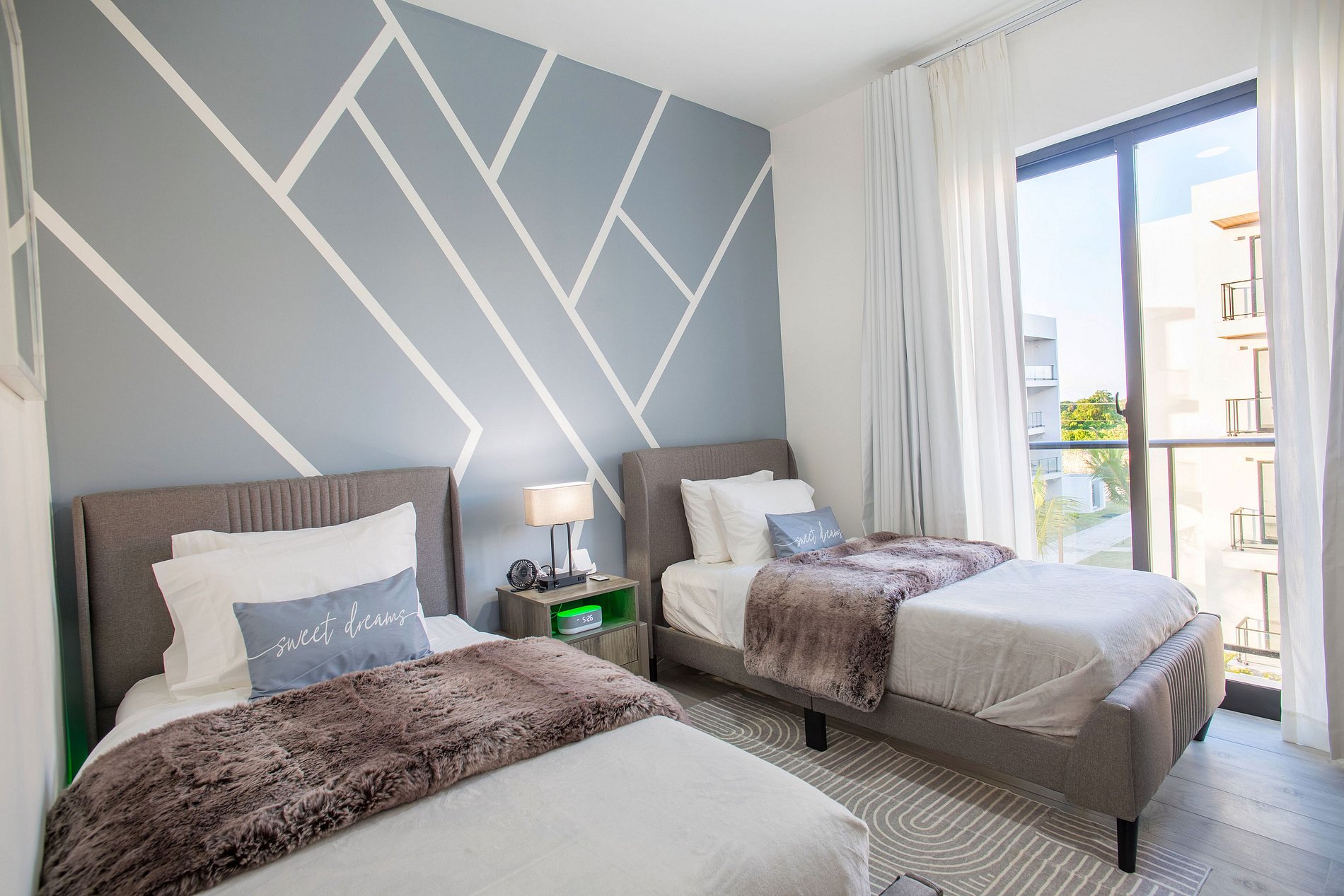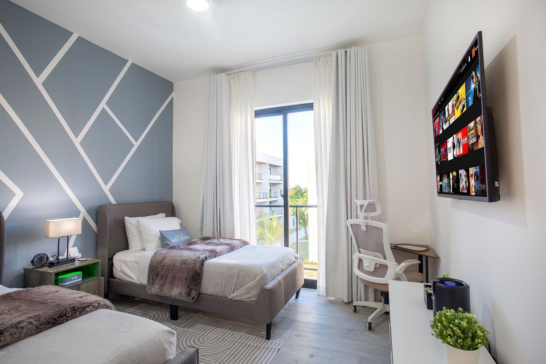 En la sala te espera una televisión Smart para disfrutar de tus series y películas favoritas, un comedor, ideal para momentos inolvidables. La cocina, completamente equipada, invita a explorar tu talento culinario con electrodomésticos de primera. Disfruta de la comodidad de un medio baño en la sala y dos habitaciones, cada una con su propio baño privado. La habitación principal tiene una cama Queen, mientras que la secundaria ofrece dos acogedoras camas Twin, ambas con Smart TV. Desde el balcón, déjate seducir por la impresionante vista a la piscina. La decoración, sofisticada y lujosa, transforma cada rincón en un ambiente cautivador que hará de tu estancia una experiencia verdaderamente memorable.