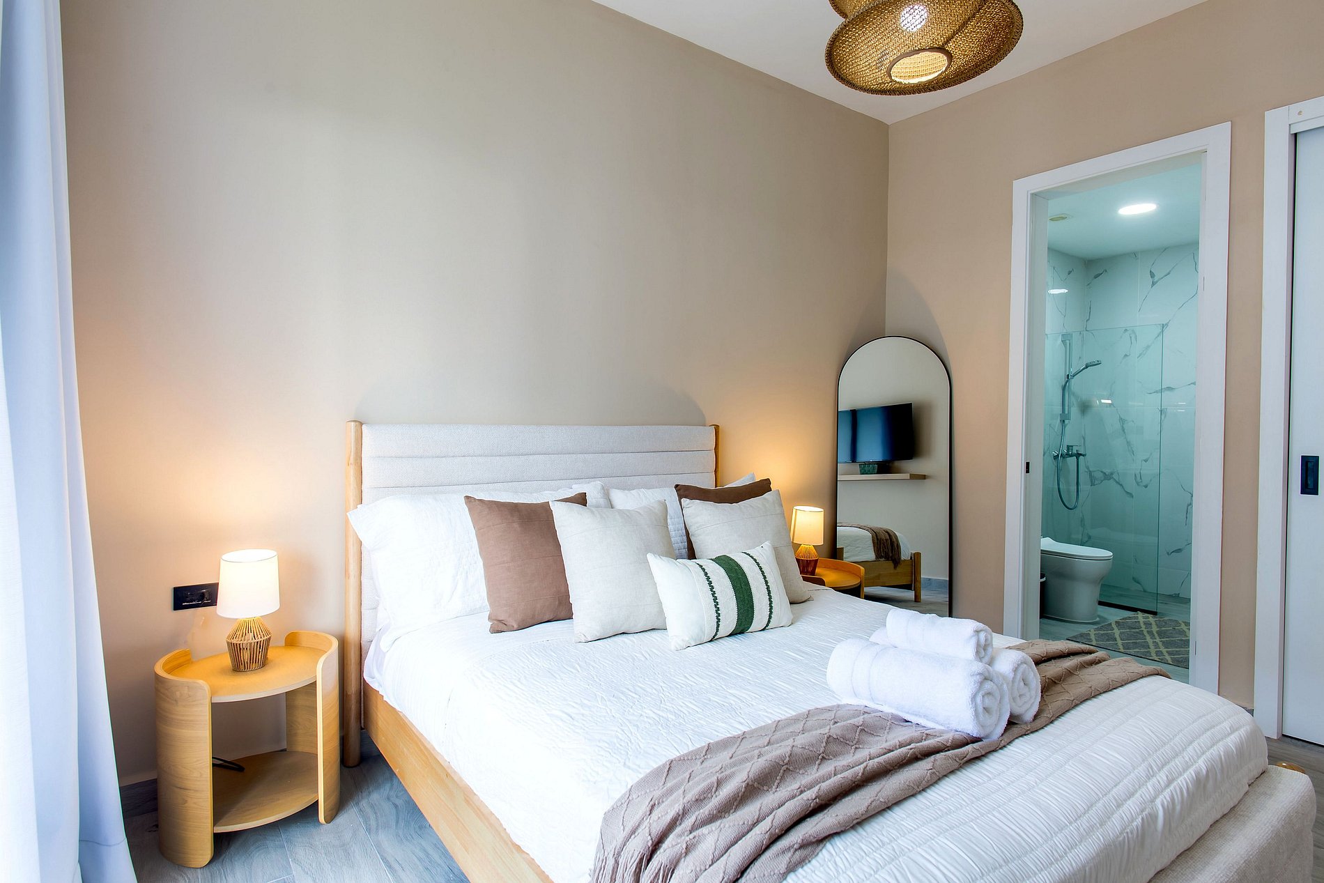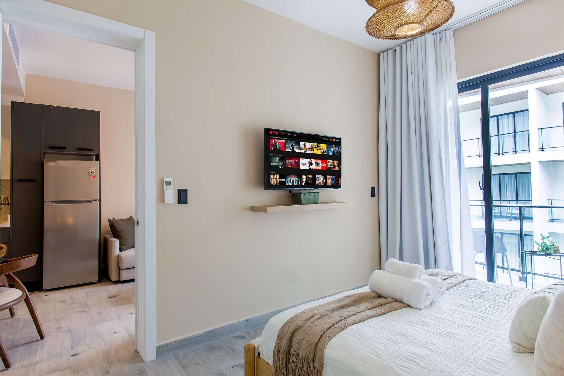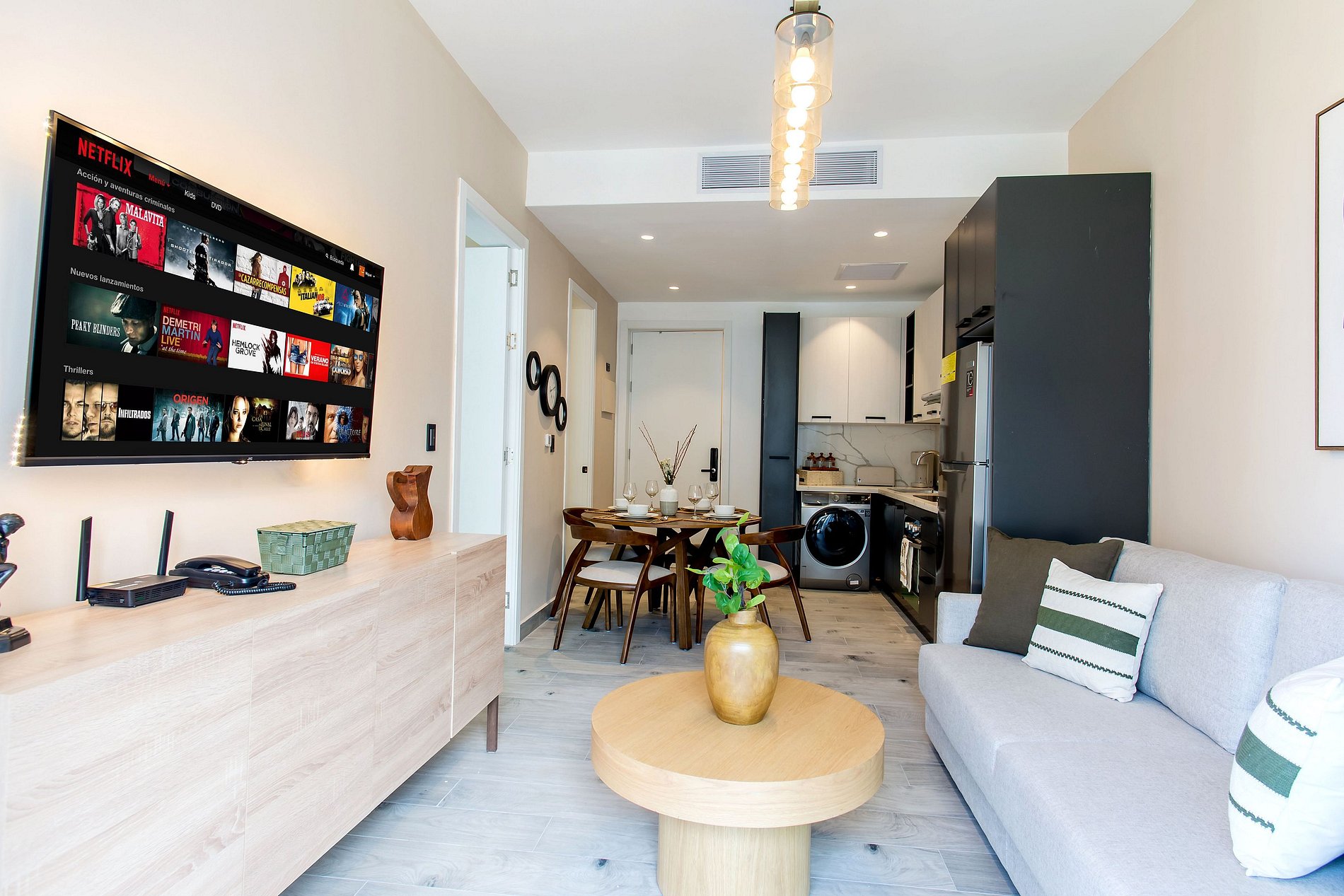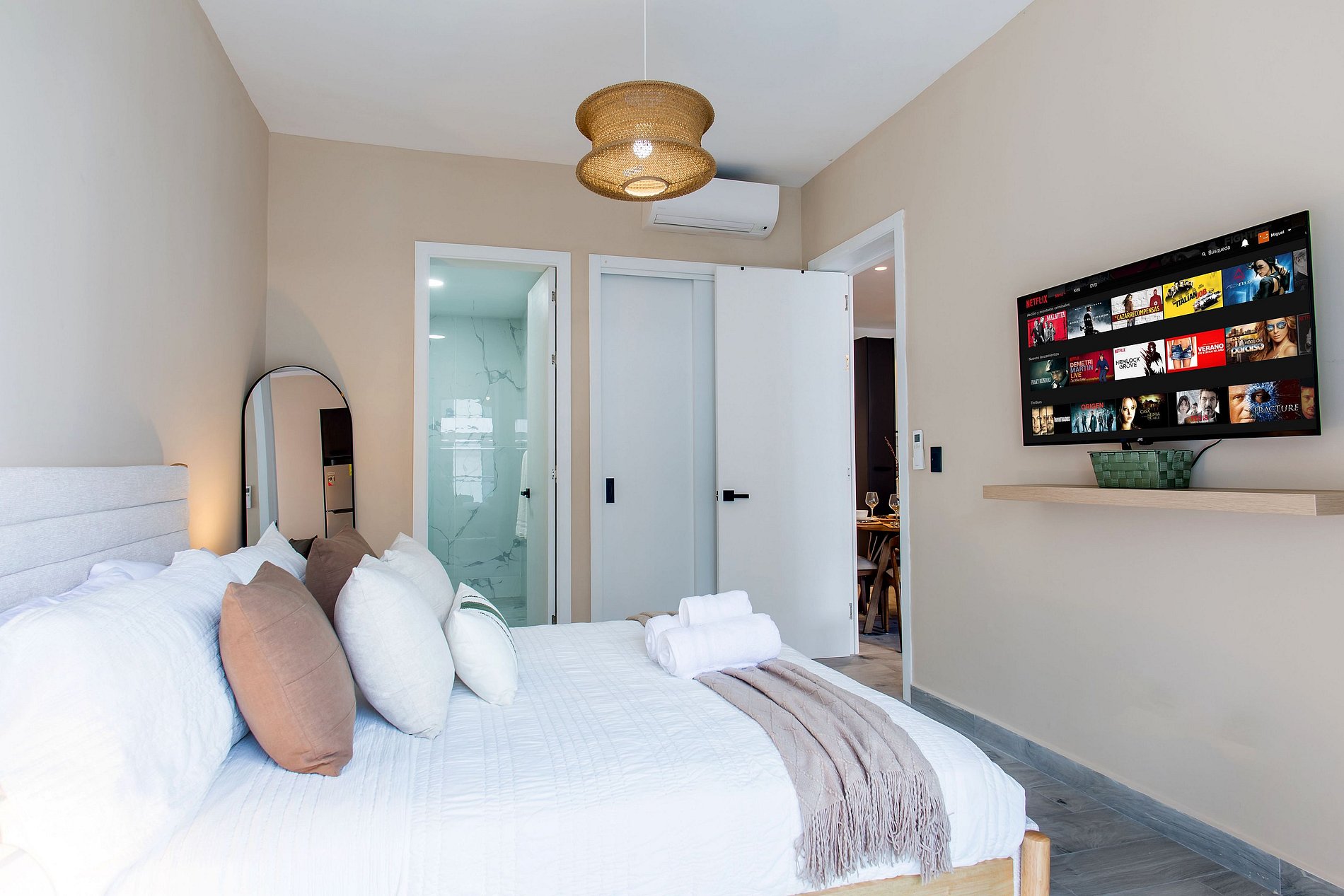 Este lujoso apartamento cuenta con una sala equipada con un sofá cama y una televisión smart, además de un medio baño. La cocina totalmente equipada y el comedor completo son perfectos para disfrutar de momentos memorables, mientras que el balcón ofrece vistas al jardín. La habitación incluye una cama queen, otra televisión smart y un baño privado, garantizando comodidad y privacidad en cada rincón de este espacio ideal para tu estancia.