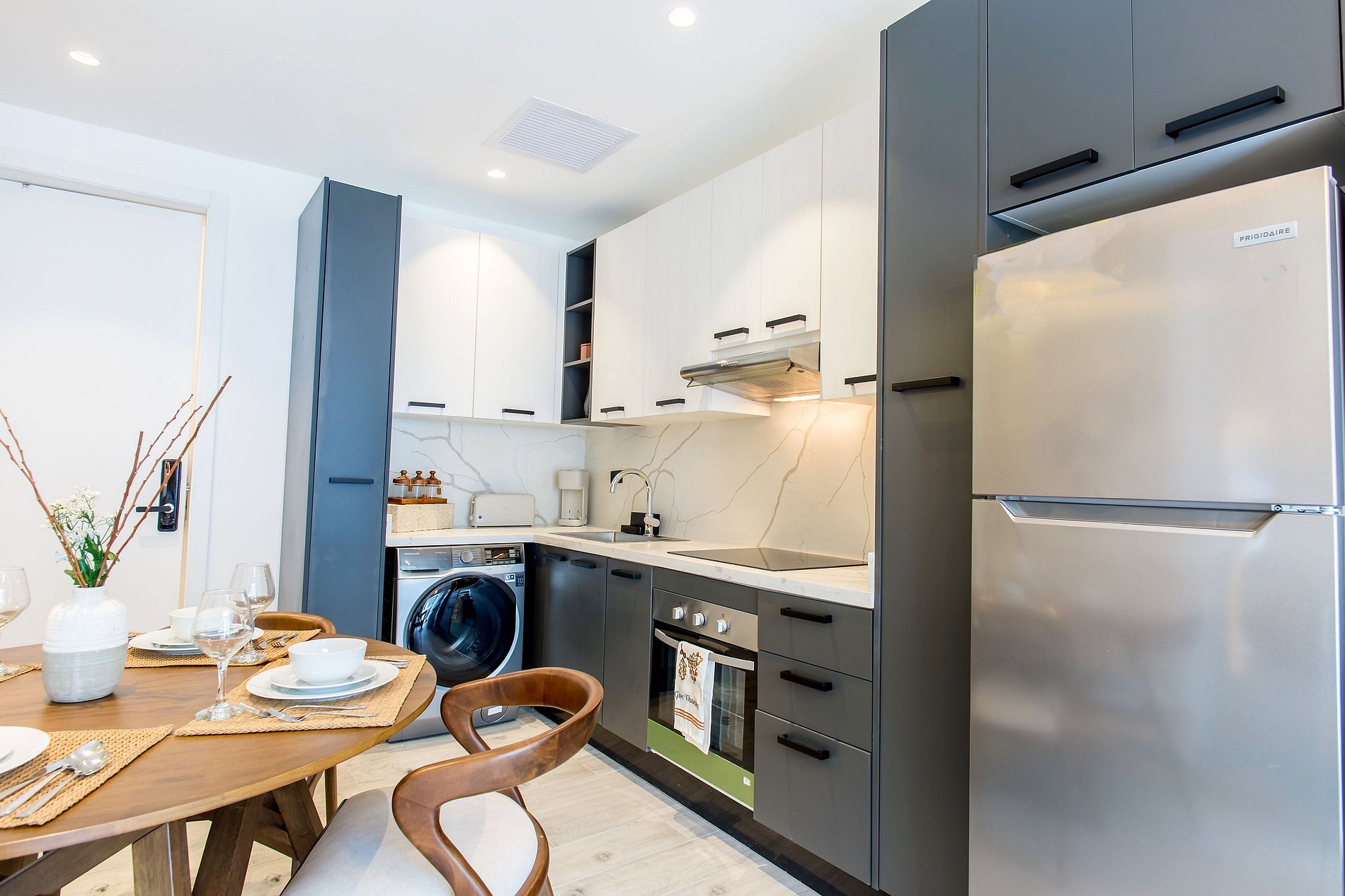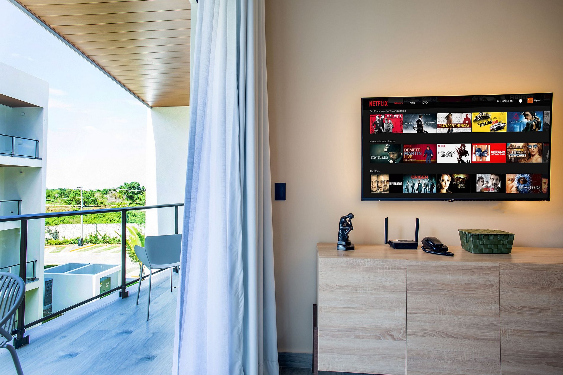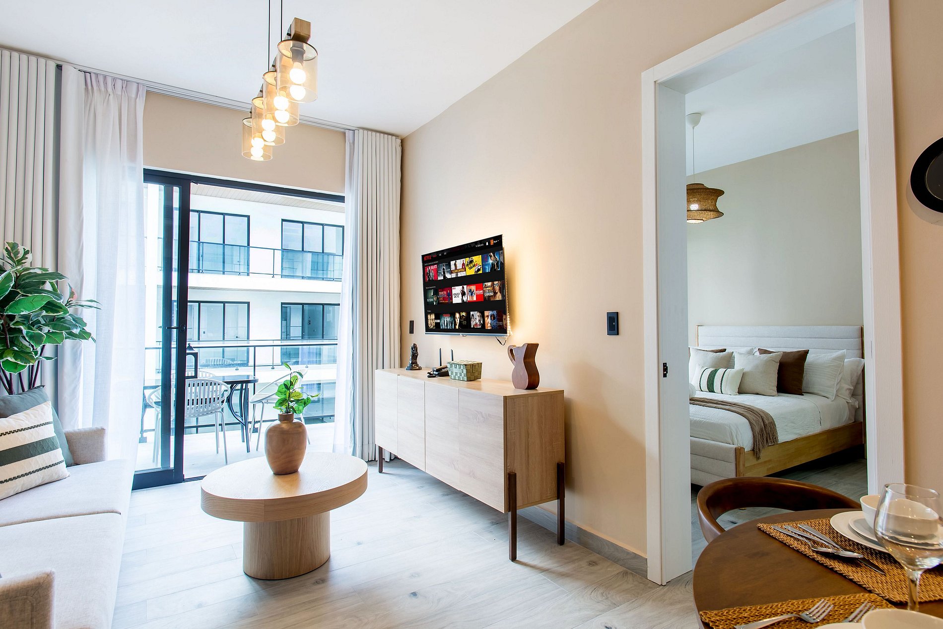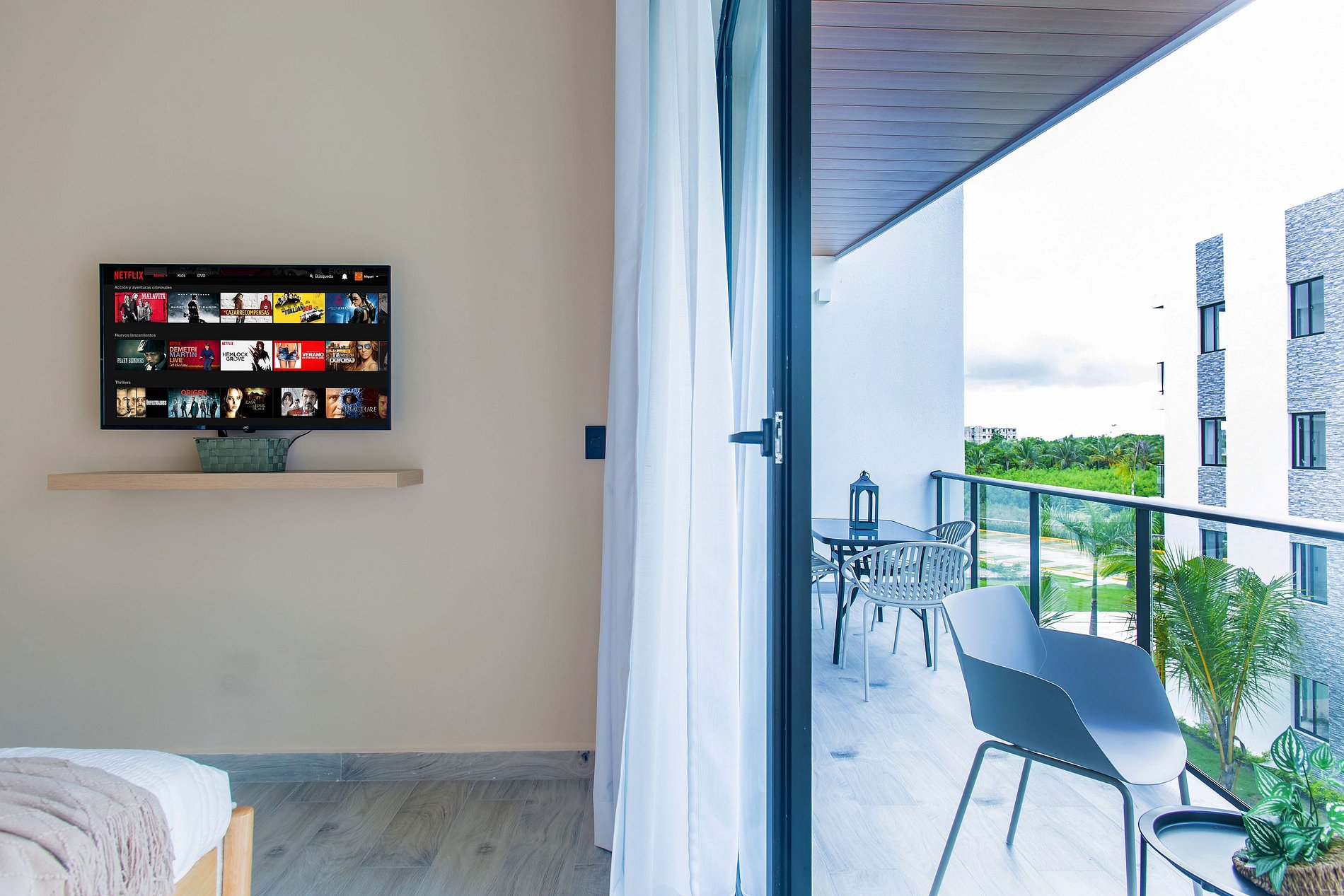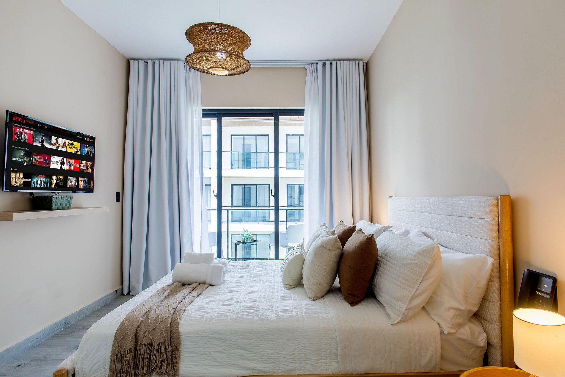 Este lujoso apartamento cuenta con una sala equipada con un sofá cama y una televisión smart, además de un medio baño. La cocina totalmente equipada y el comedor completo son perfectos para disfrutar de momentos memorables, mientras que el balcón ofrece vistas al jardín. La habitación incluye una cama queen, otra televisión smart y un baño privado, garantizando comodidad y privacidad en cada rincón de este espacio ideal para tu estancia.