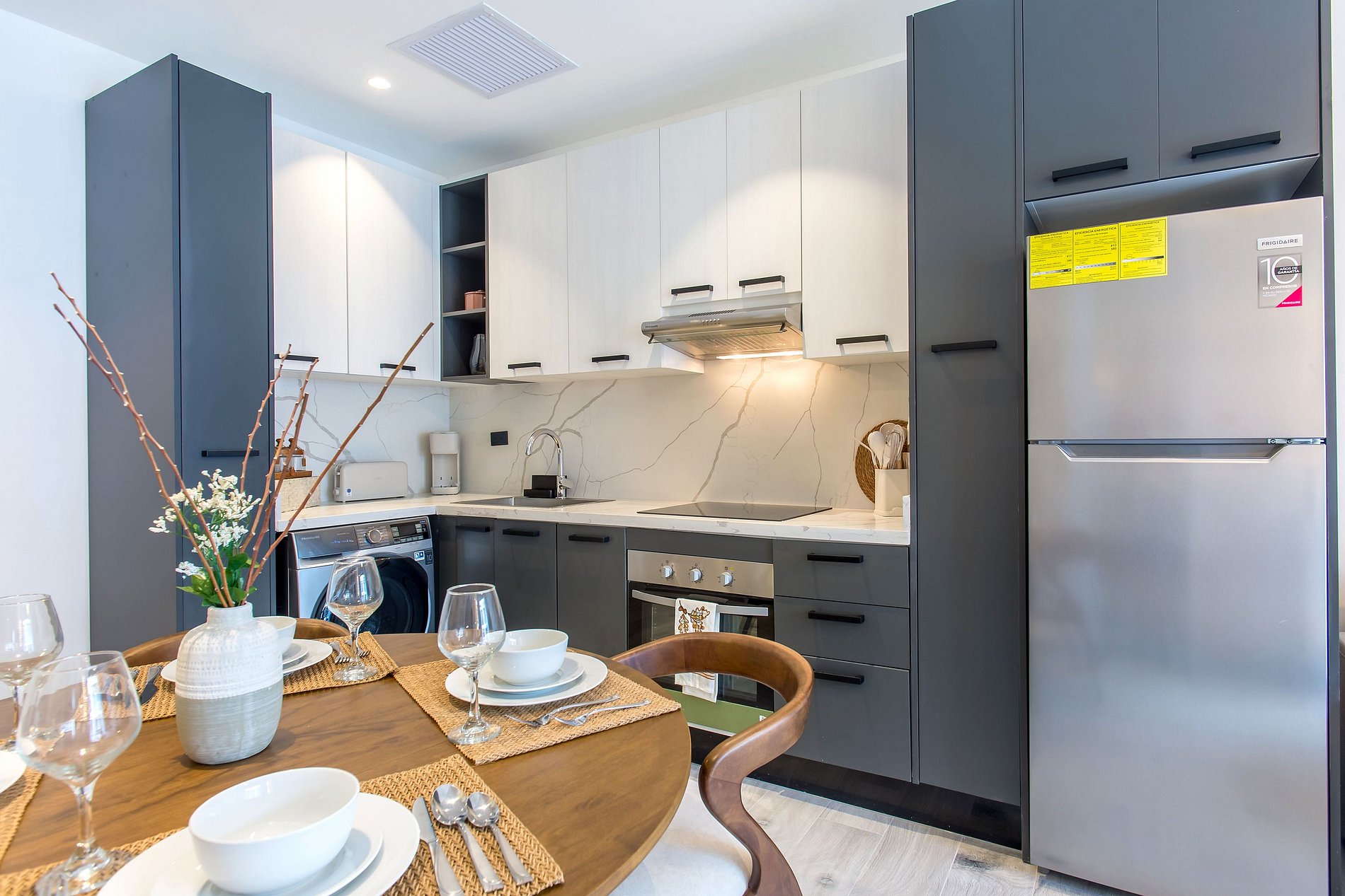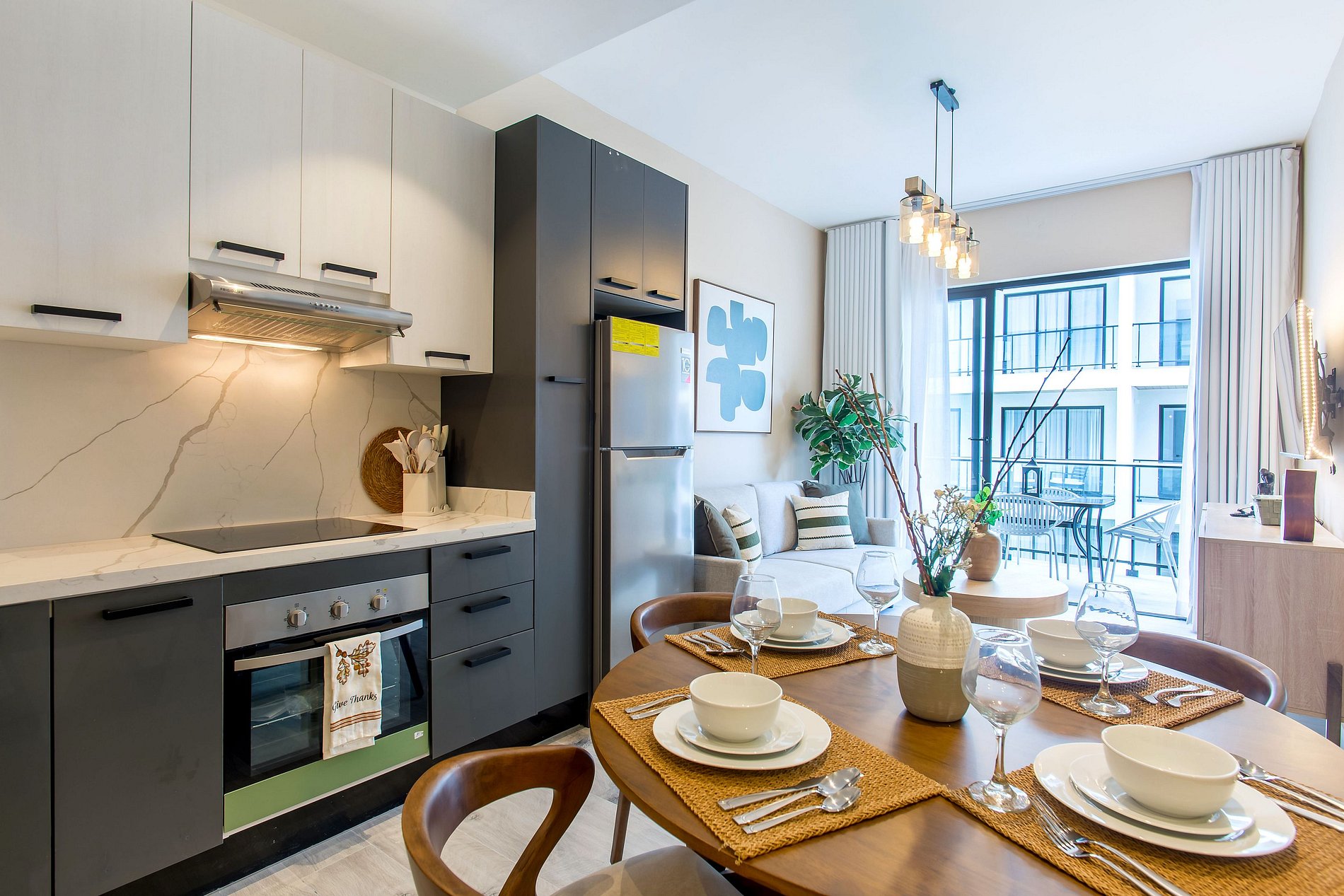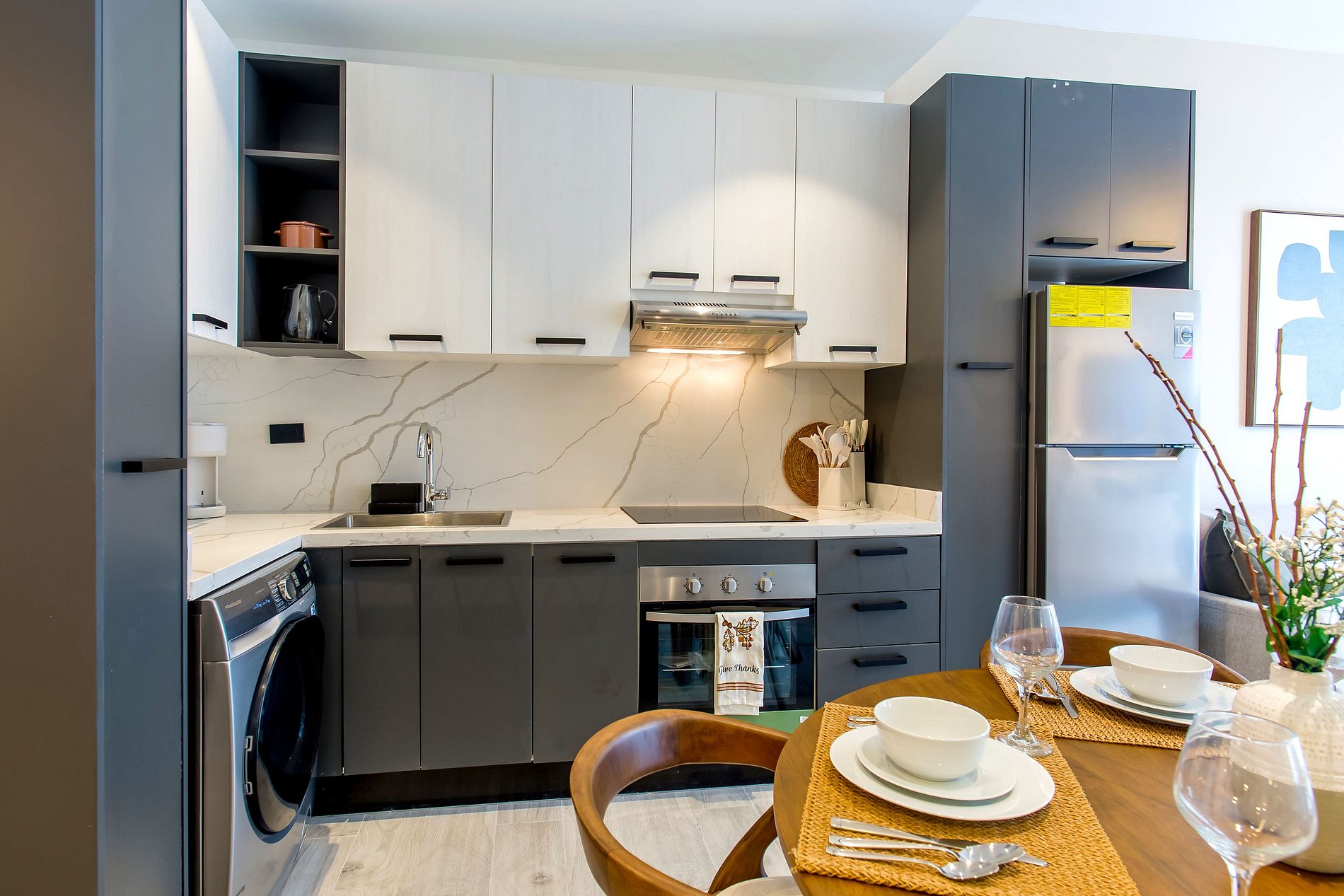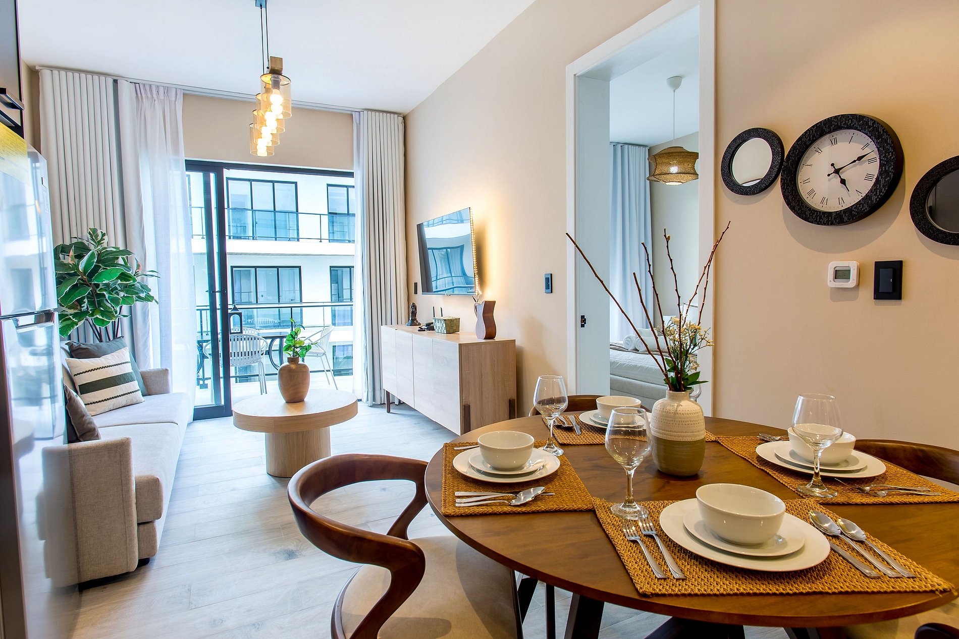 Este lujoso apartamento cuenta con una sala equipada con un sofá cama y una televisión smart, además de un medio baño. La cocina totalmente equipada y el comedor completo son perfectos para disfrutar de momentos memorables, mientras que el balcón ofrece vistas al jardín. La habitación incluye una cama queen, otra televisión smart y un baño privado, garantizando comodidad y privacidad en cada rincón de este espacio ideal para tu estancia.