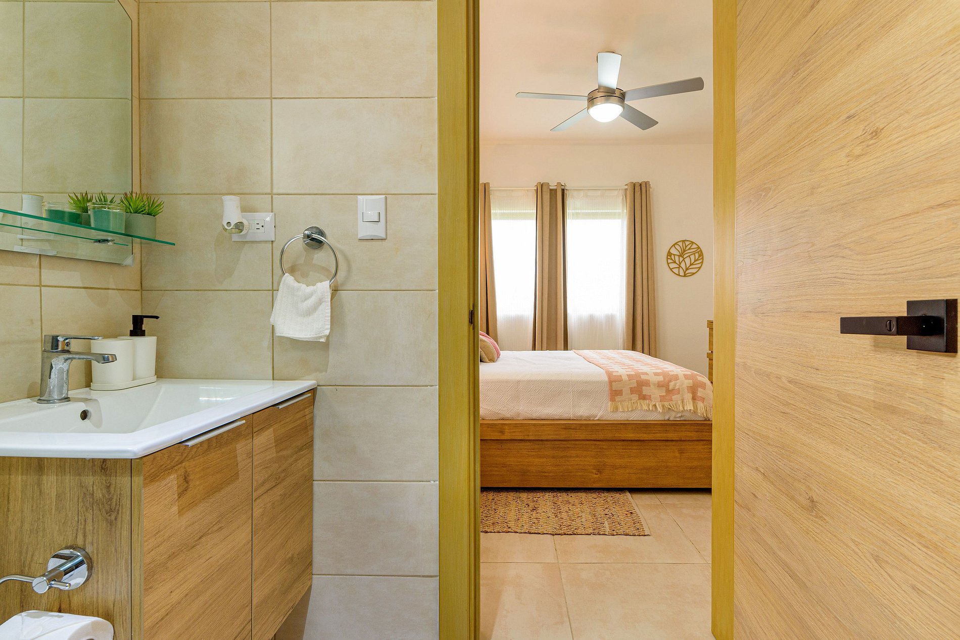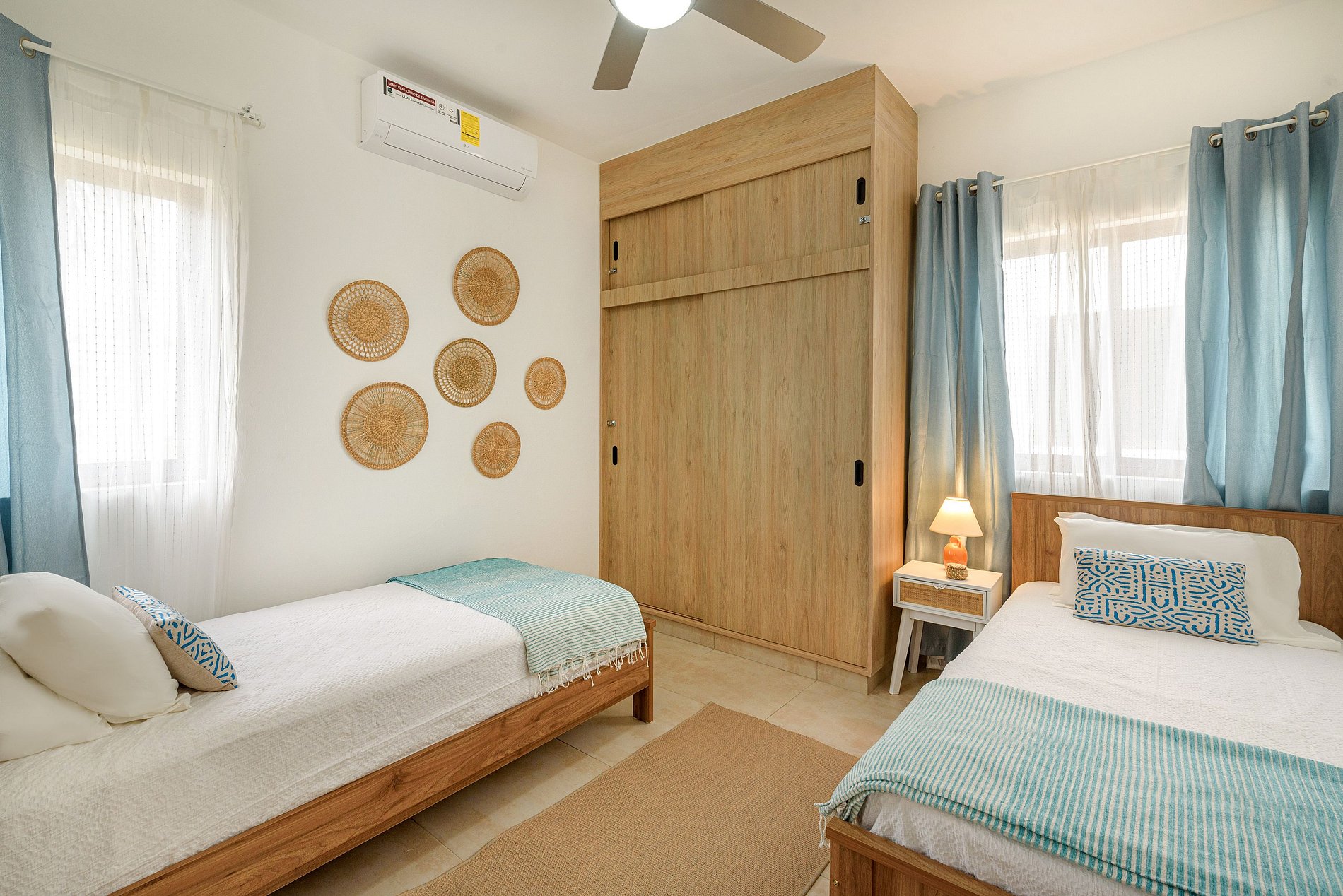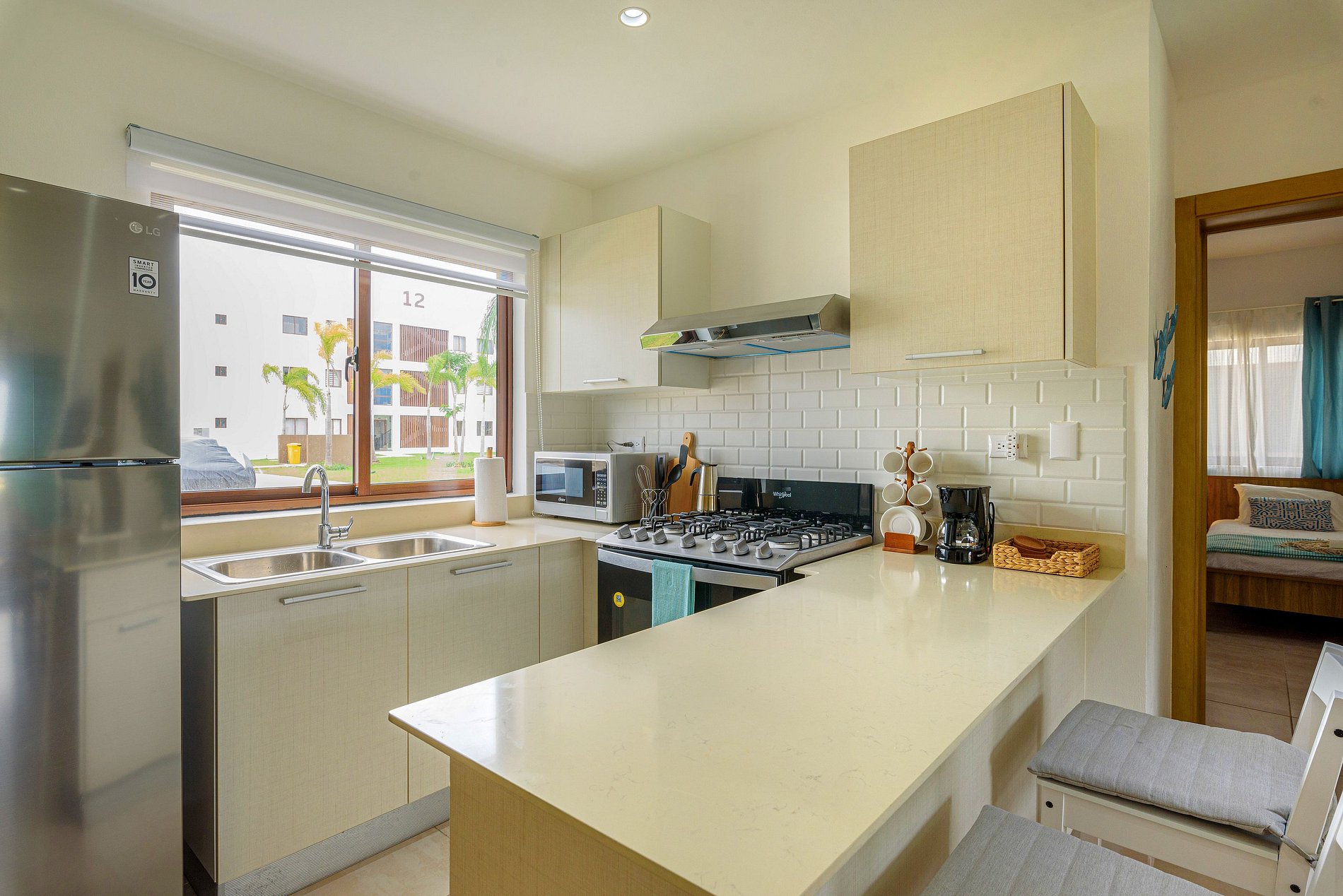 Cuanta con dos habitaciones, cada una con su baño privado. La habitación principal tiene con una lujosa cama Queen y un amplio walking closet, mientras que la habitación secundaria dispone de dos cómodas camas Twin. En la sala, un acogedor sofá cama invita a la relajación. La sala también tiene un medio baño para mayor comodidad. La cocina está completamente equipada para despertar tus sentidos culinarios. Ubicado frente a la piscina, este espacio te brinda serenidad y vistas inspiradoras. Disfruta de la experiencia sensorial única que ofrece este hogar.