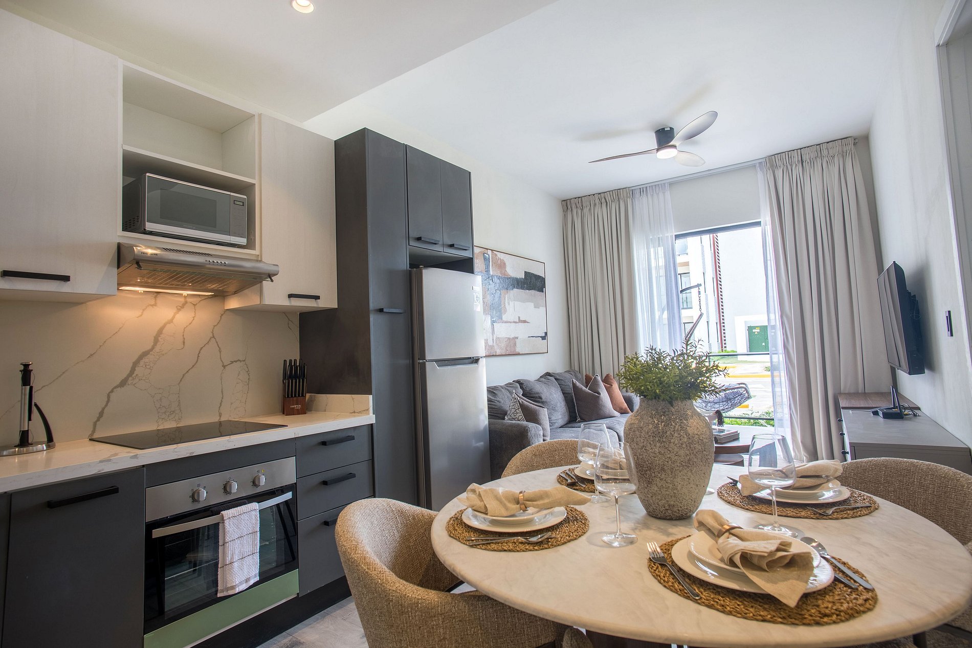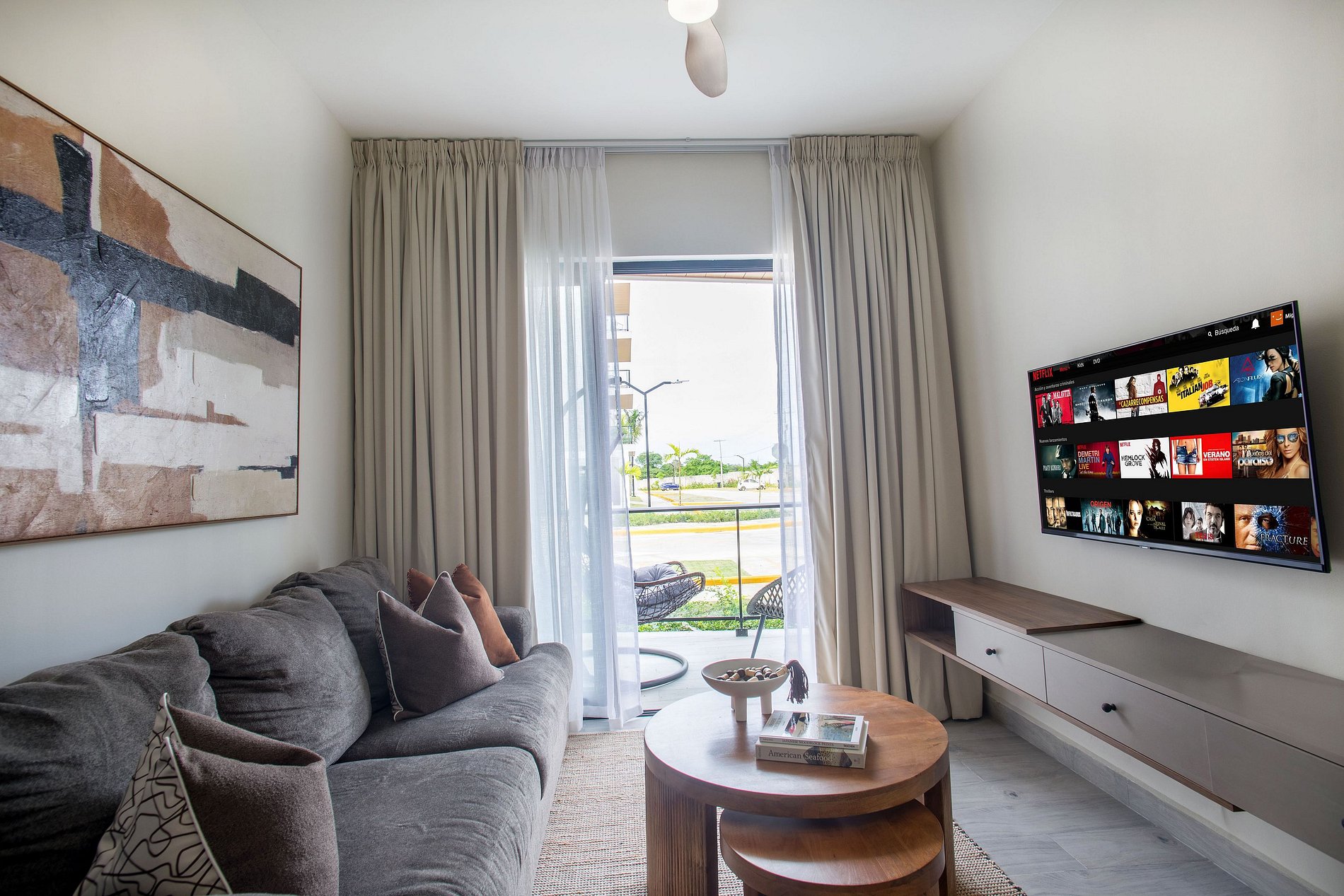 El apartamento está ubicado en el primer piso, ofreciendo fácil acceso y mayor comodidad; cuenta con una sala acogedora con sofá y Smart TV, comedor, cocina totalmente equipada y un medio baño adicional para mayor conveniencia. La habitación principal dispone de una cómoda cama king size, baño privado y Smart TV, creando un espacio ideal para el descanso y una estadía confortable en Punta Cana.
