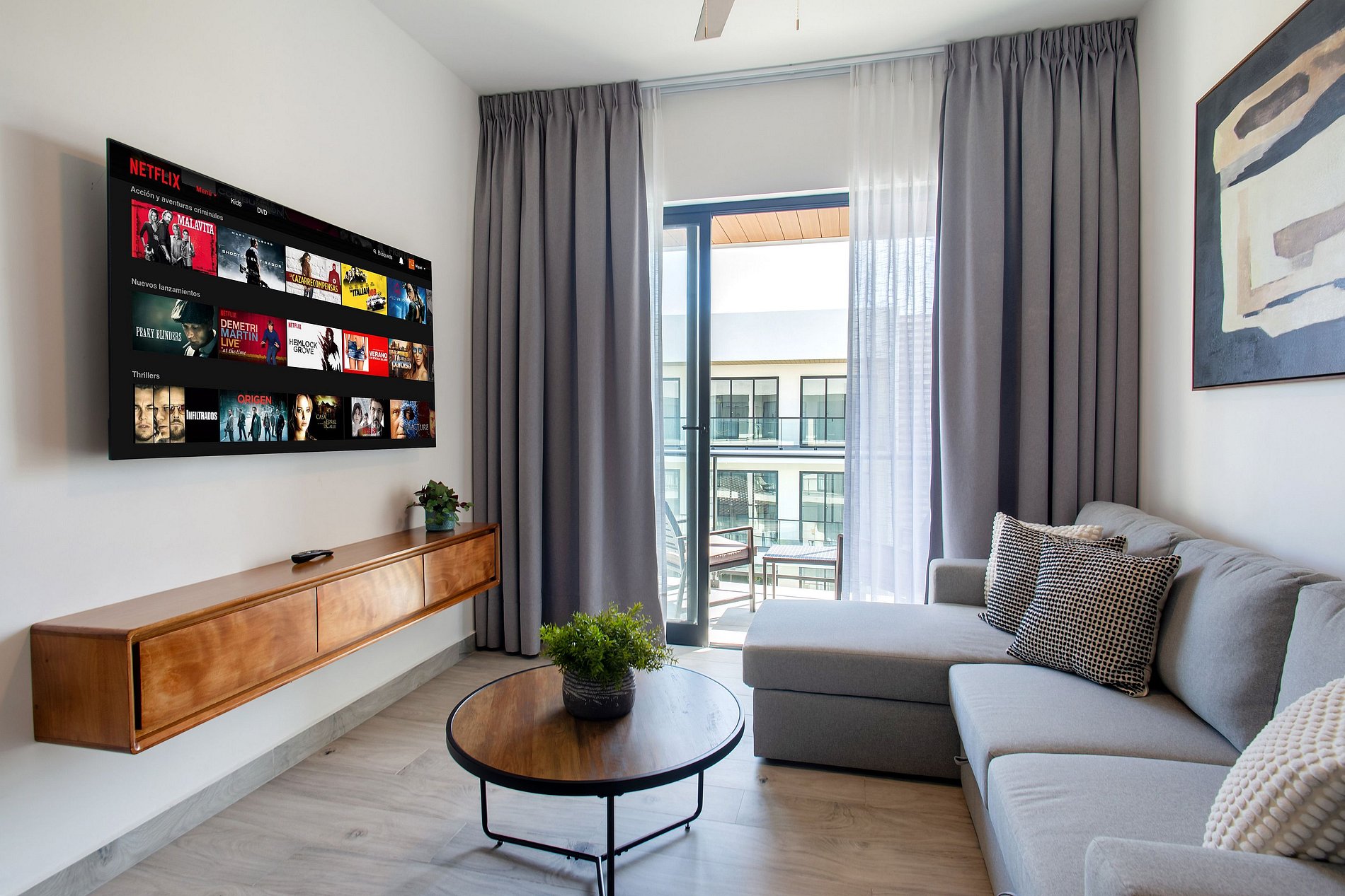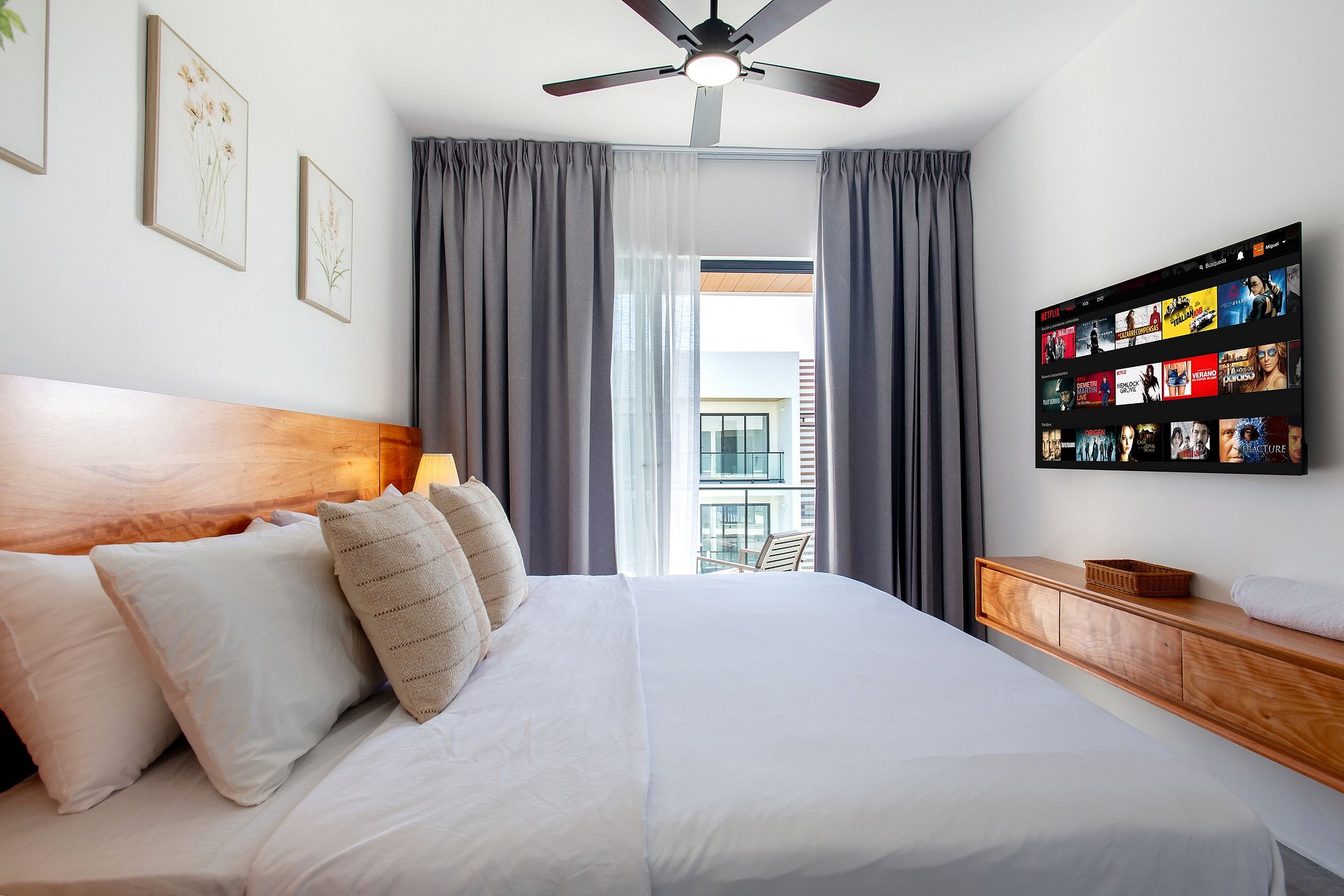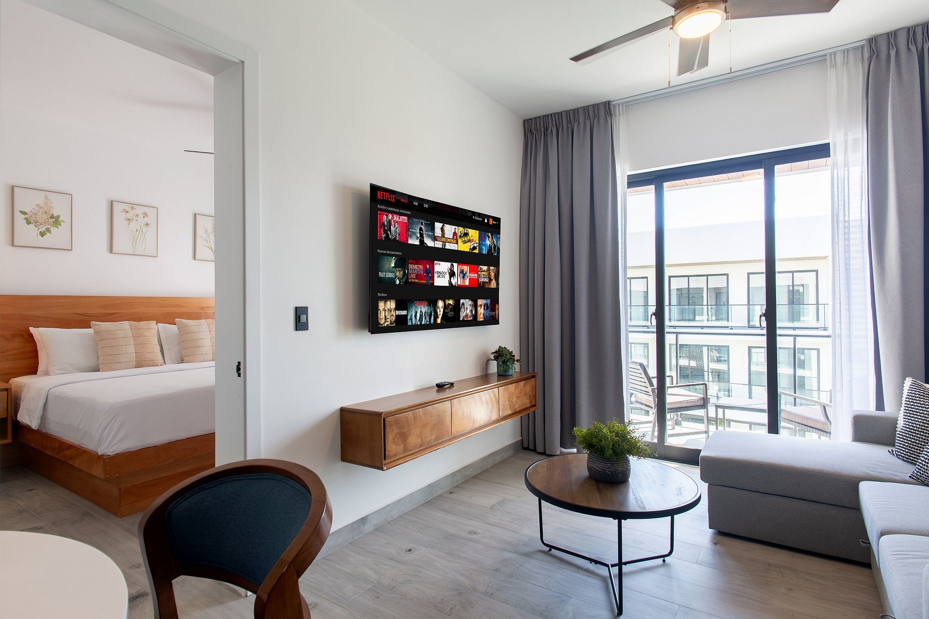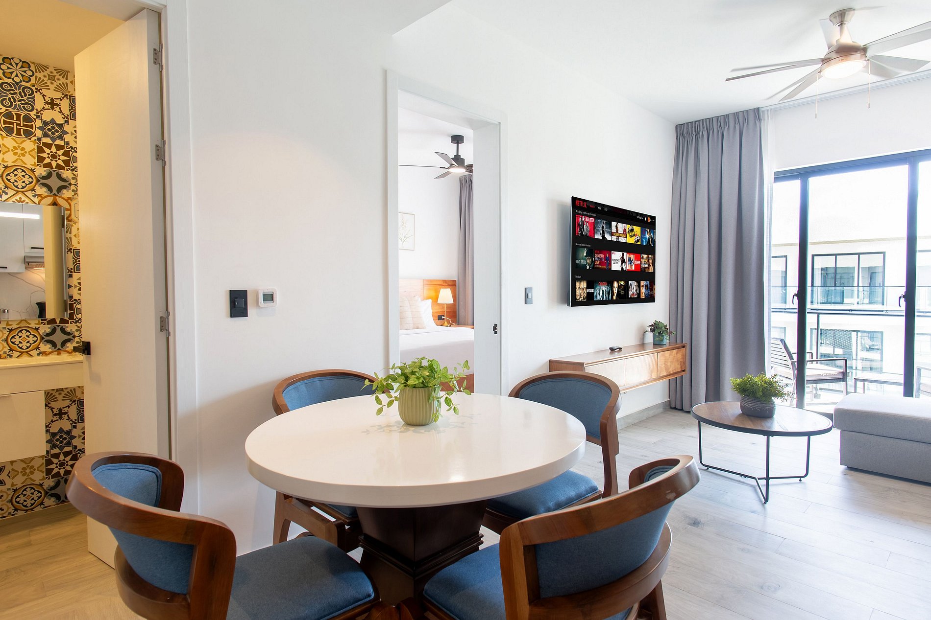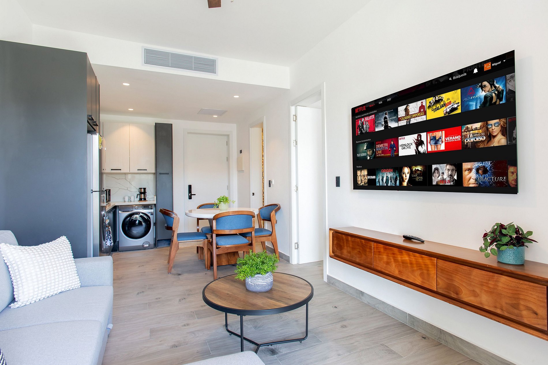 Al ingresar, la sala te recibe con un espacio cómodo y funcional, que incluye un sofá cama ideal para relajarte, una Smart TV para disfrutar de tus series y películas favoritas, y un comedor acogedor perfecto para desayunos tranquilos o cenas especiales. La cocina, totalmente equipada, te brinda la libertad de preparar tus comidas con facilidad. El apartamento dispone de un medio baño en el área social y una habitación con su propio baño, donde te espera una amplia cama King Size y Smart TV, creando el ambiente ideal para descansar y disfrutar cada momento de tu estadía.
