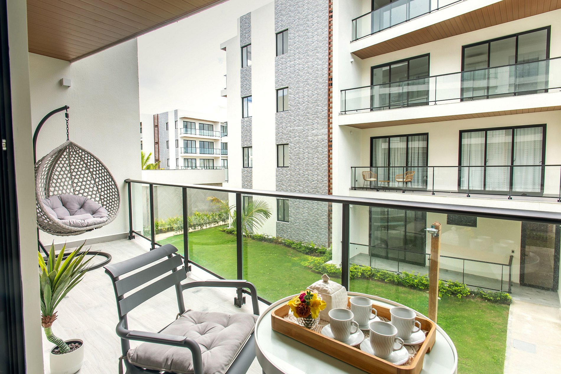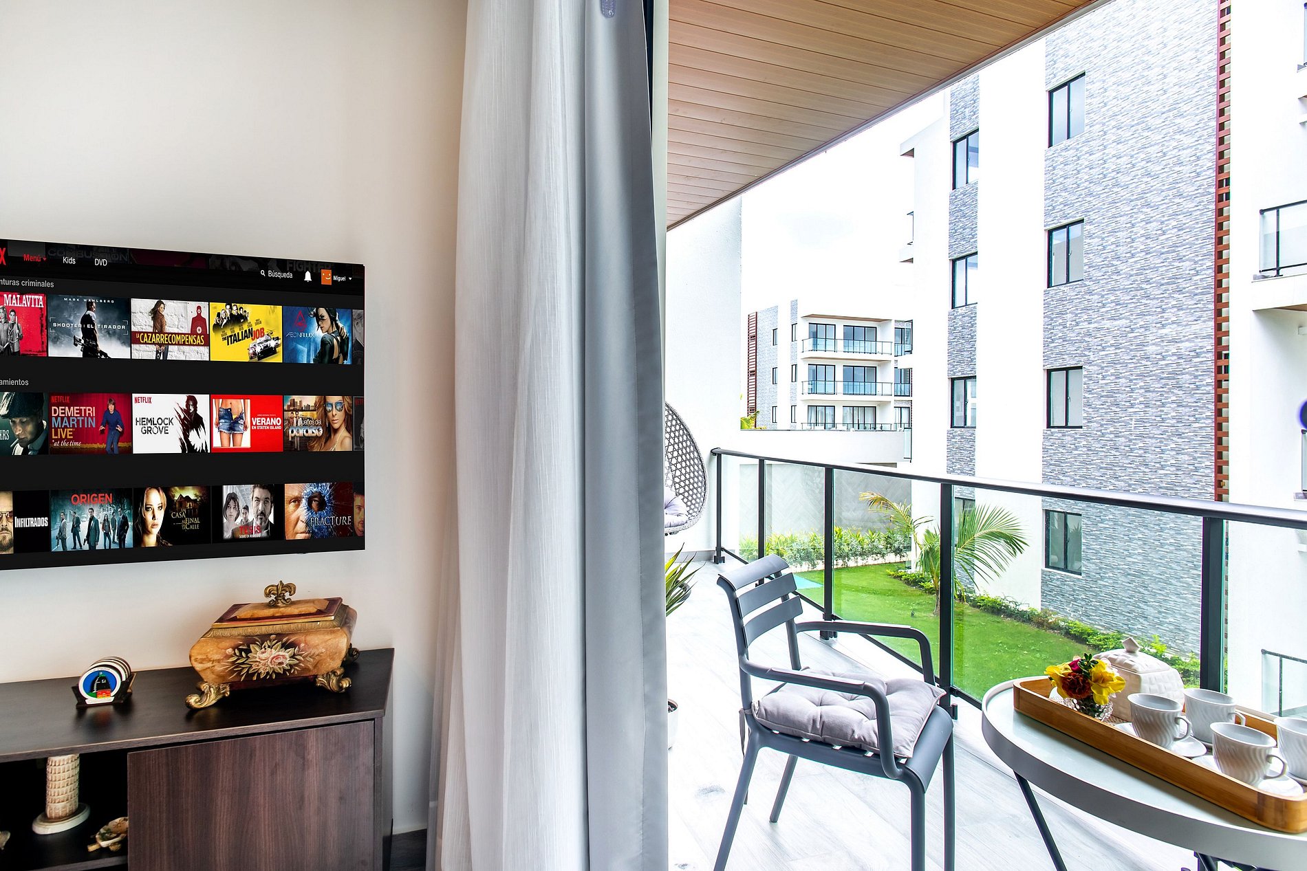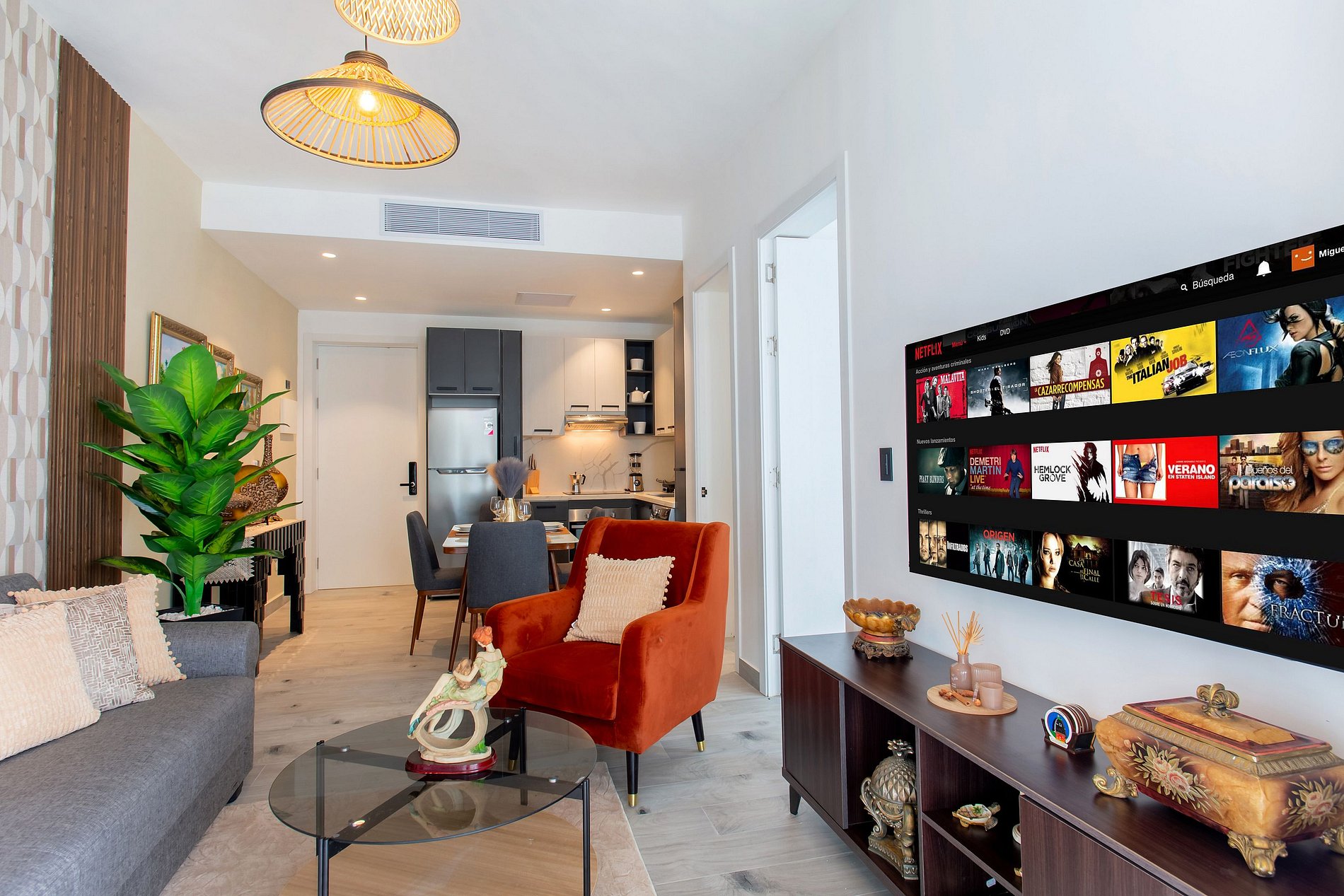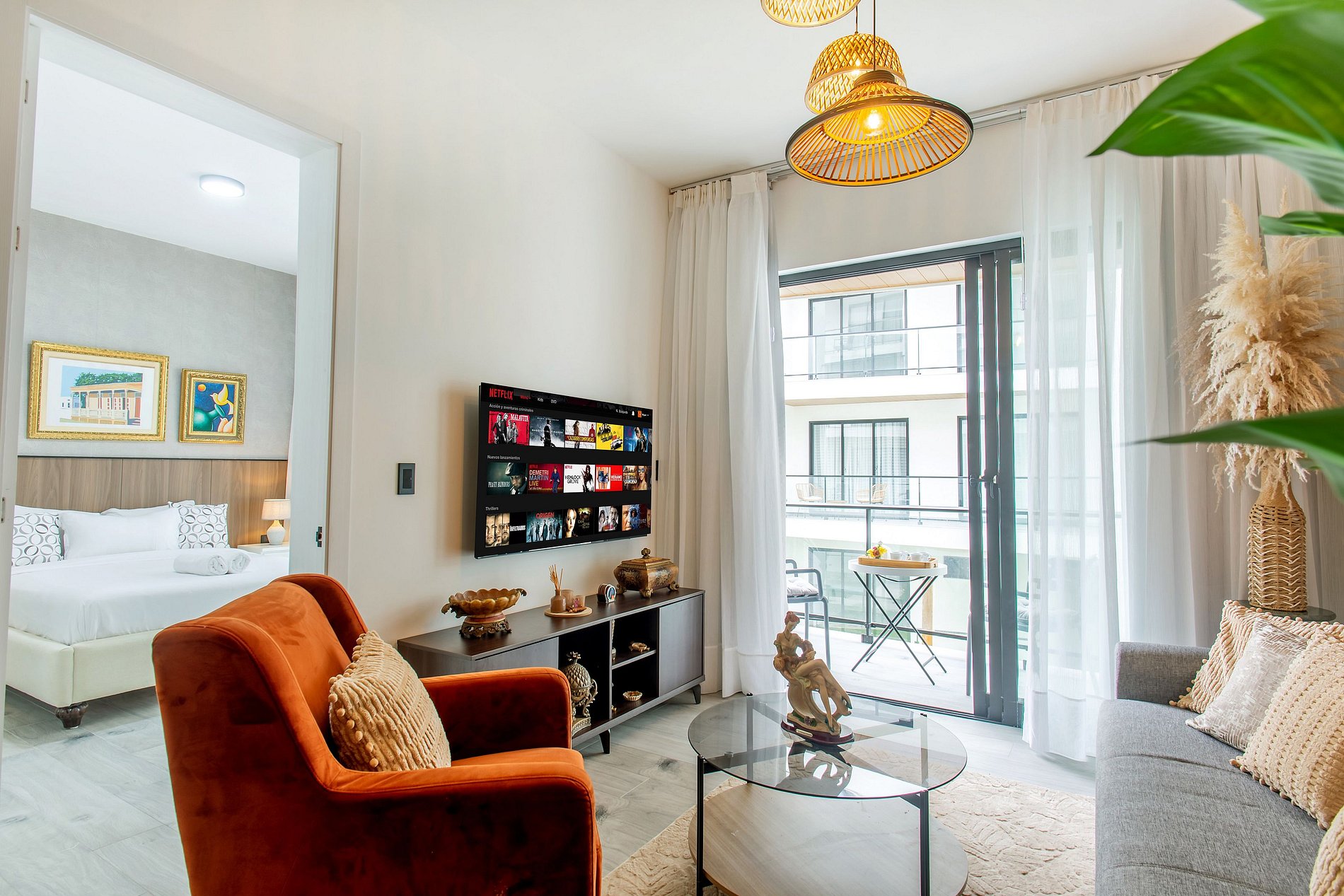 Al entrar al apartamento, te recibe una sala acogedora y bien distribuida, ideal para relajarte después de un día disfrutando Punta Cana. Aquí encontrarás un sofá cama cómodo y una Smart TV, perfectos para descansar, ver una película o compartir un momento tranquilo. También cuenta con un medio baño, un comedor para disfrutar tus comidas con calma y una cocina completamente equipada, que te brinda la libertad de preparar desde un desayuno ligero hasta una cena especial. Desde el balcón con vista al jardín, podrás disfrutar de un ambiente sereno que invita a desconectar y respirar el aire tropical.