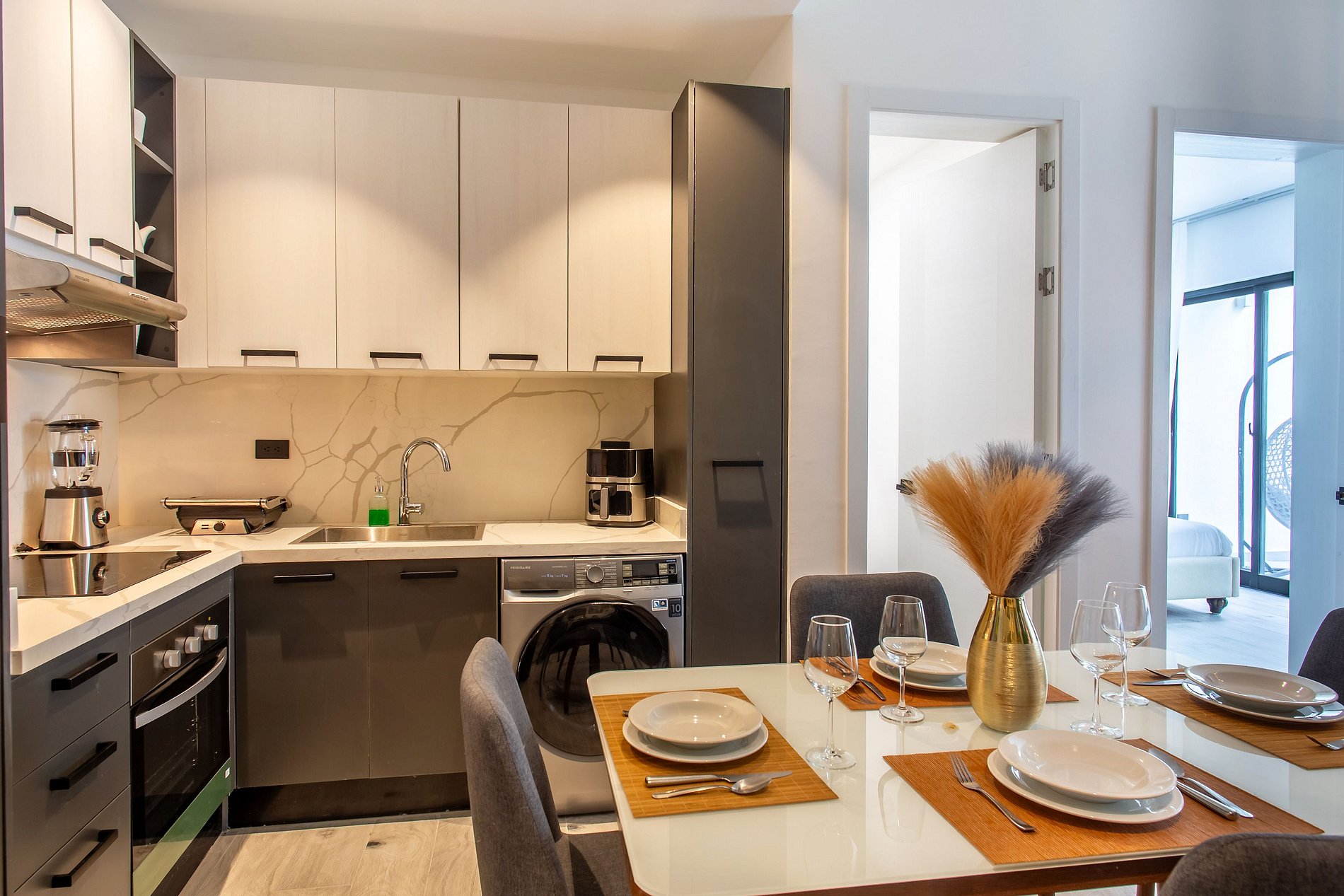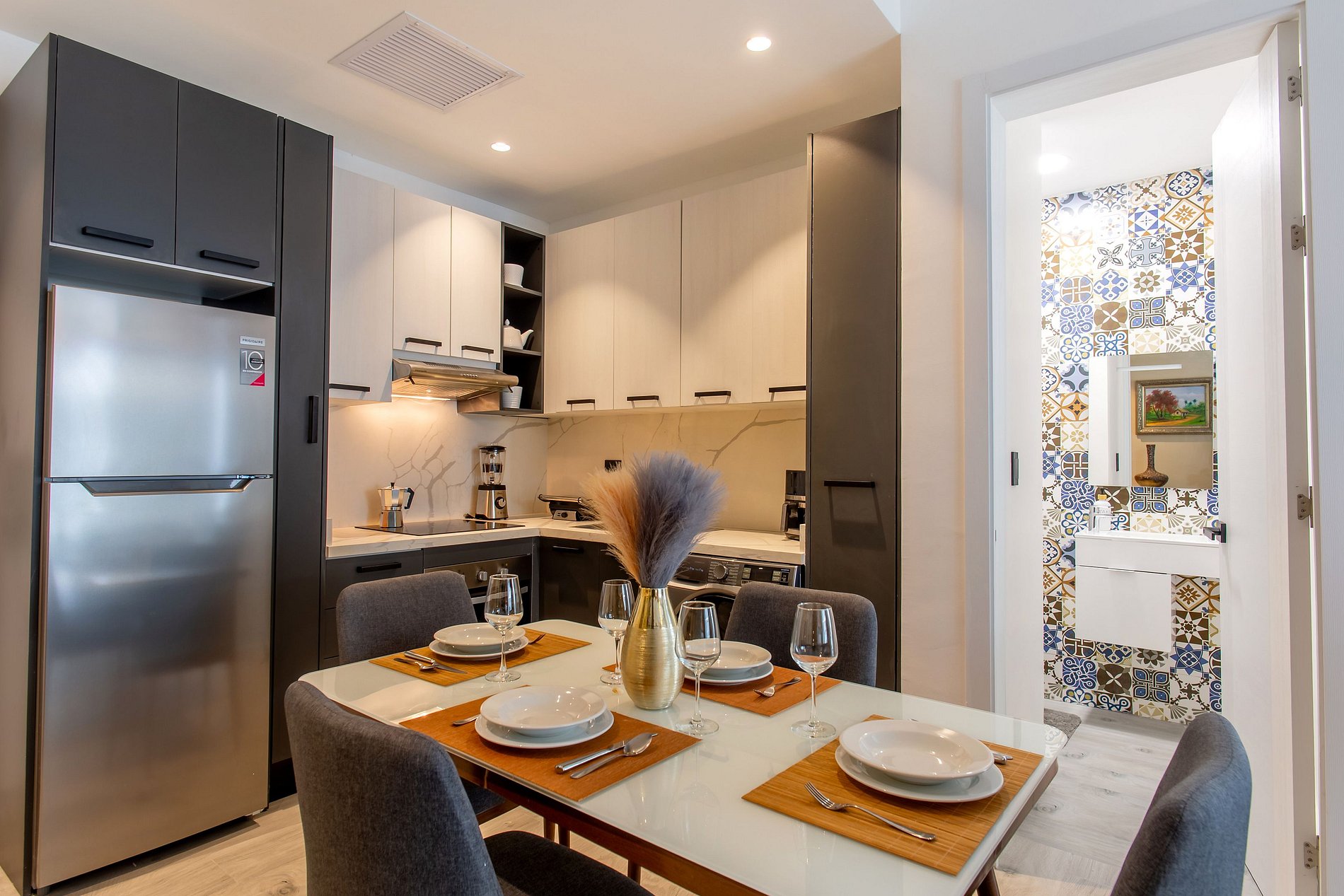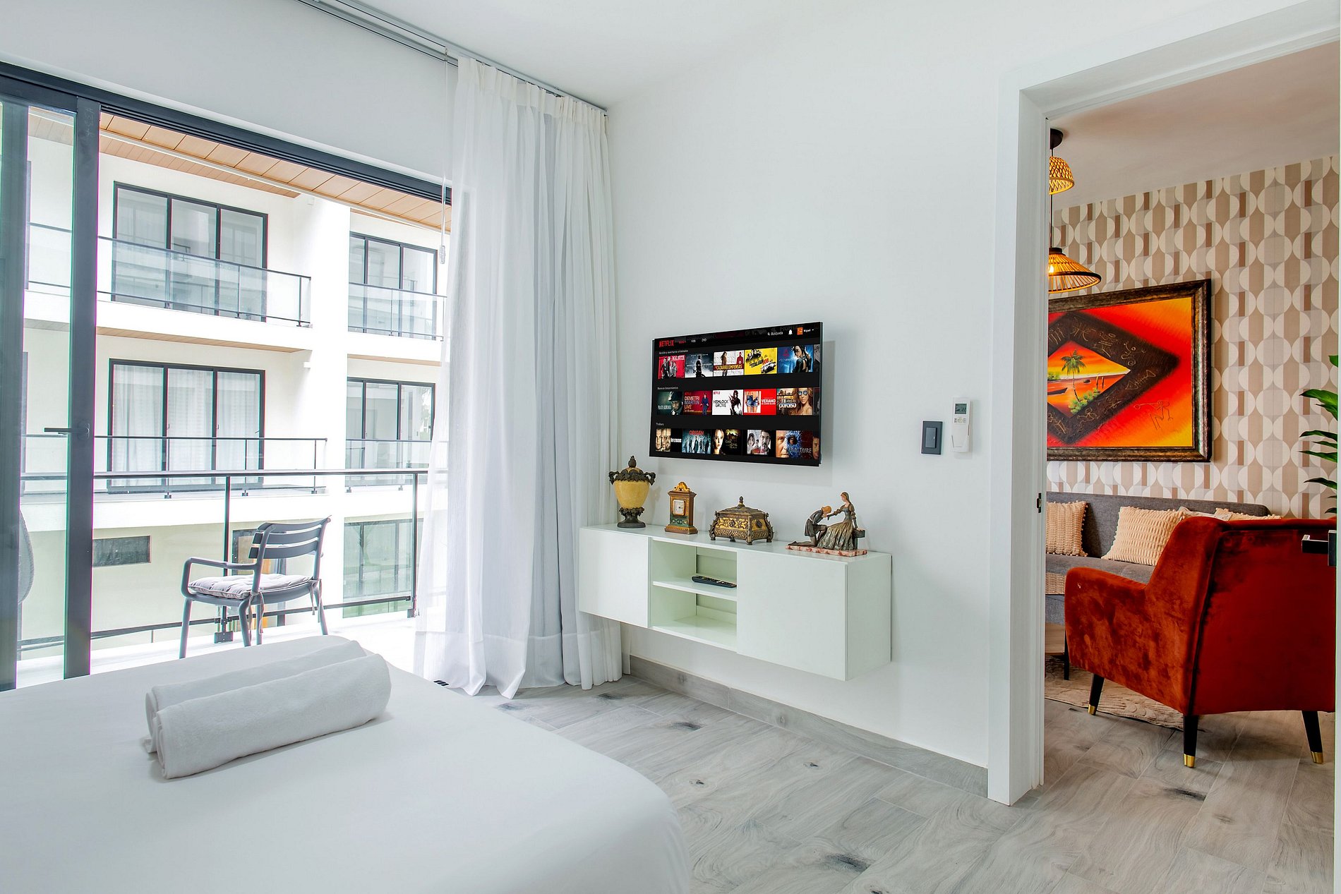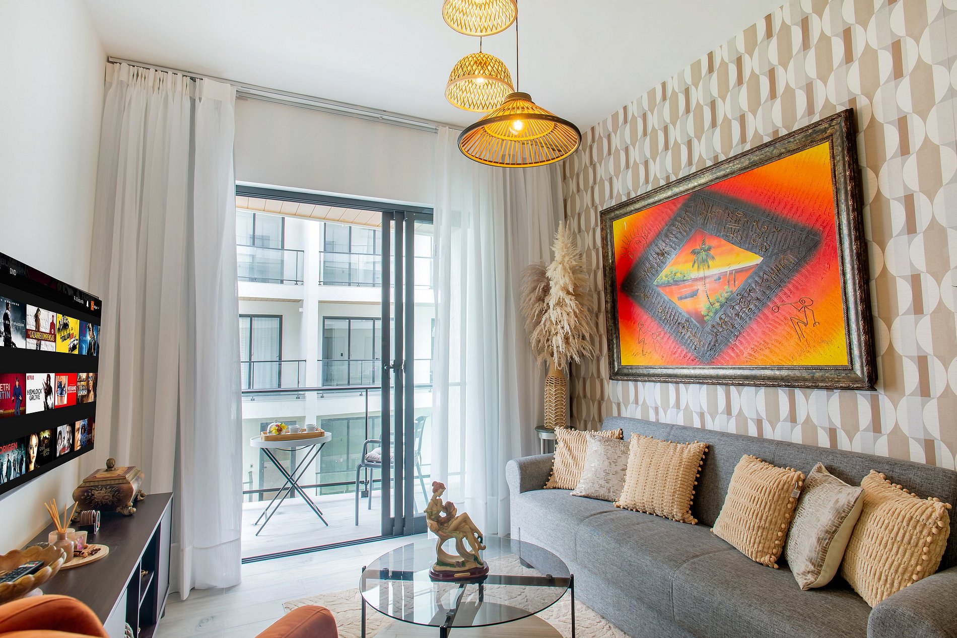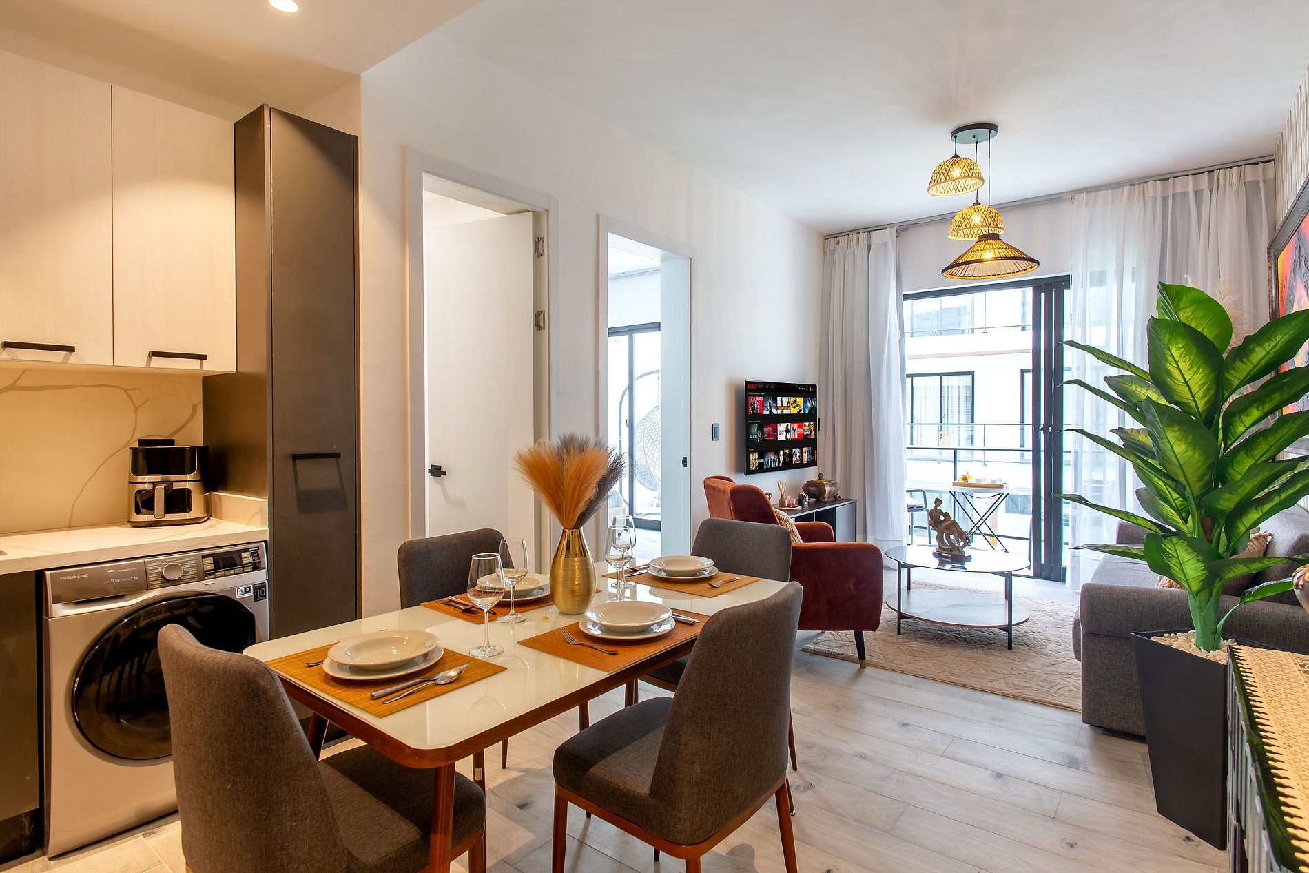Al entrar al apartamento, te recibe una sala acogedora y bien distribuida, ideal para relajarte después de un día disfrutando Punta Cana. Aquí encontrarás un sofá cama cómodo y una Smart TV, perfectos para descansar, ver una película o compartir un momento tranquilo. También cuenta con un medio baño, un comedor para disfrutar tus comidas con calma y una cocina completamente equipada, que te brinda la libertad de preparar desde un desayuno ligero hasta una cena especial. Desde el balcón con vista al jardín, podrás disfrutar de un ambiente sereno que invita a desconectar y respirar el aire tropical.