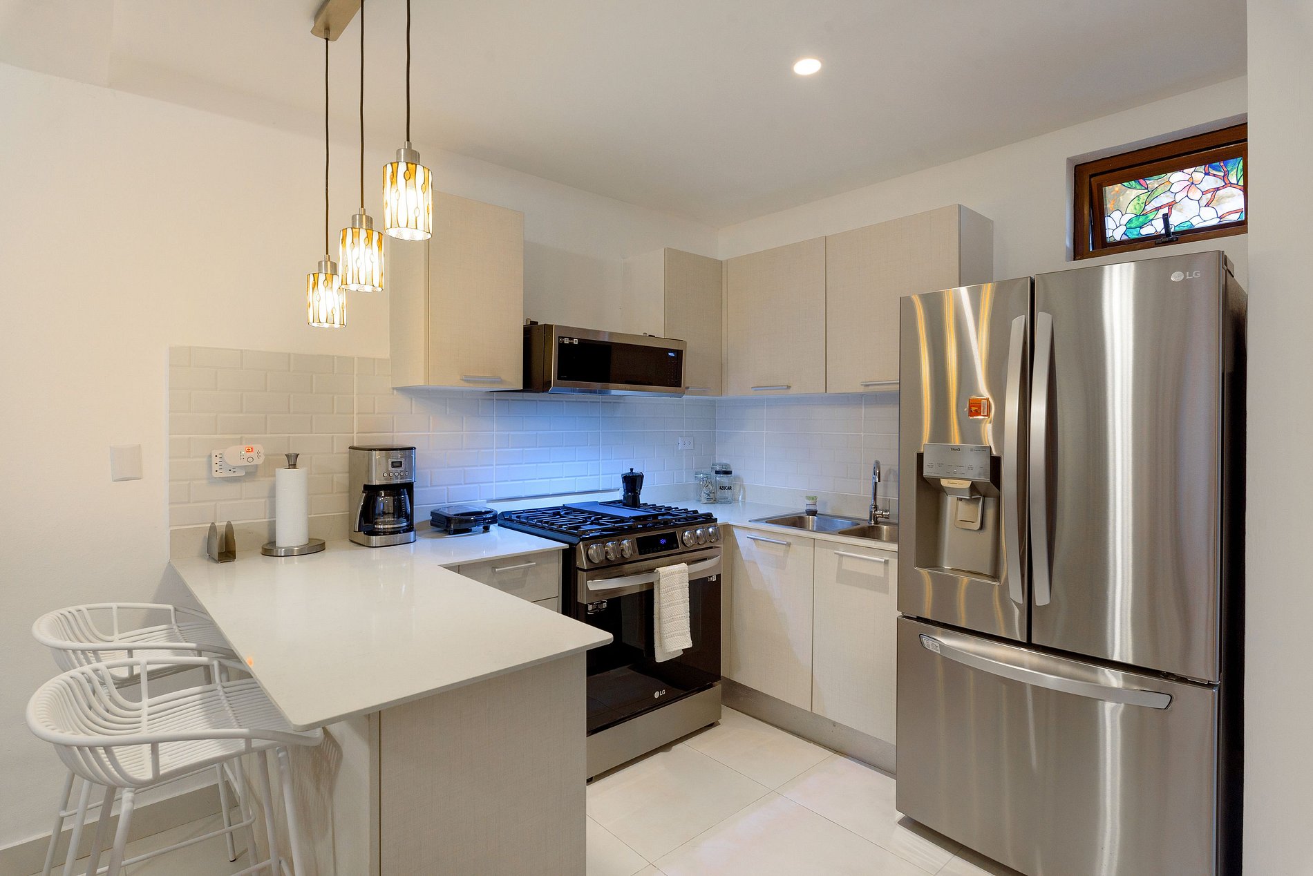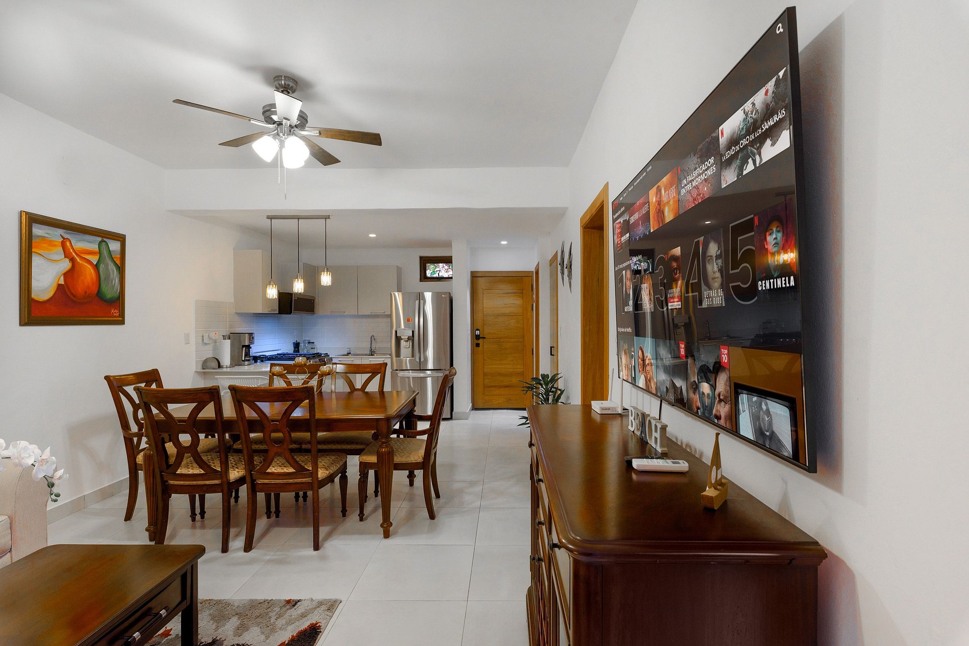 En la sala, encontrarás un comedor, un cómodo sofá, una televisión smart para tu entretenimiento y un medio baño adicional. La cocina está completamente equipada con todo lo necesario para preparar tus comidas favoritas. Este apartamento está diseñado para hacer de tu estancia una experiencia placentera.