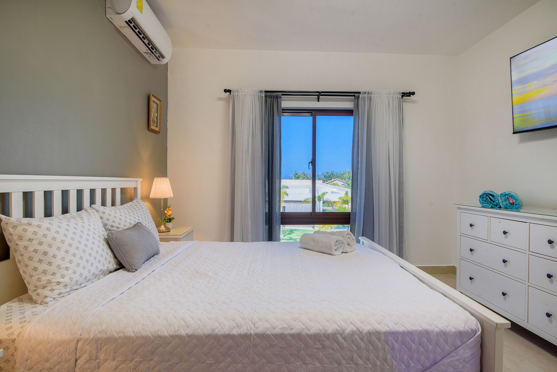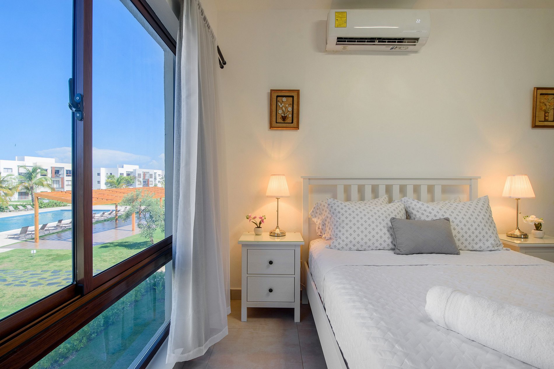 Cuenta con dos habitaciones, cada una equipada con su propio baño privado y televisión smart, para que disfrutes de tus programas favoritos sin salir de la cama. Ambas habitaciones ofrecen una vista espectacular a la piscina, creando un ambiente de tranquilidad y relajación.