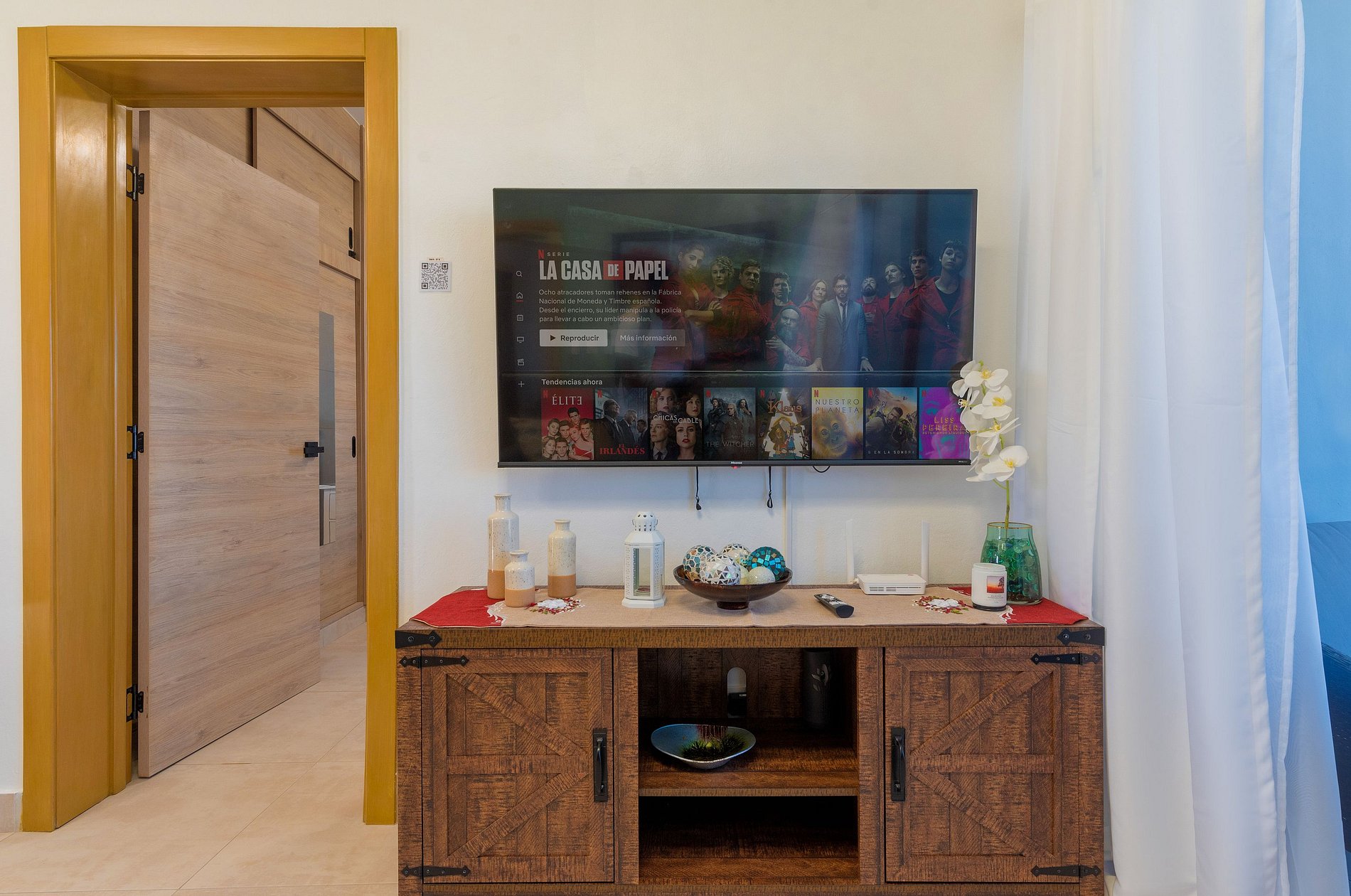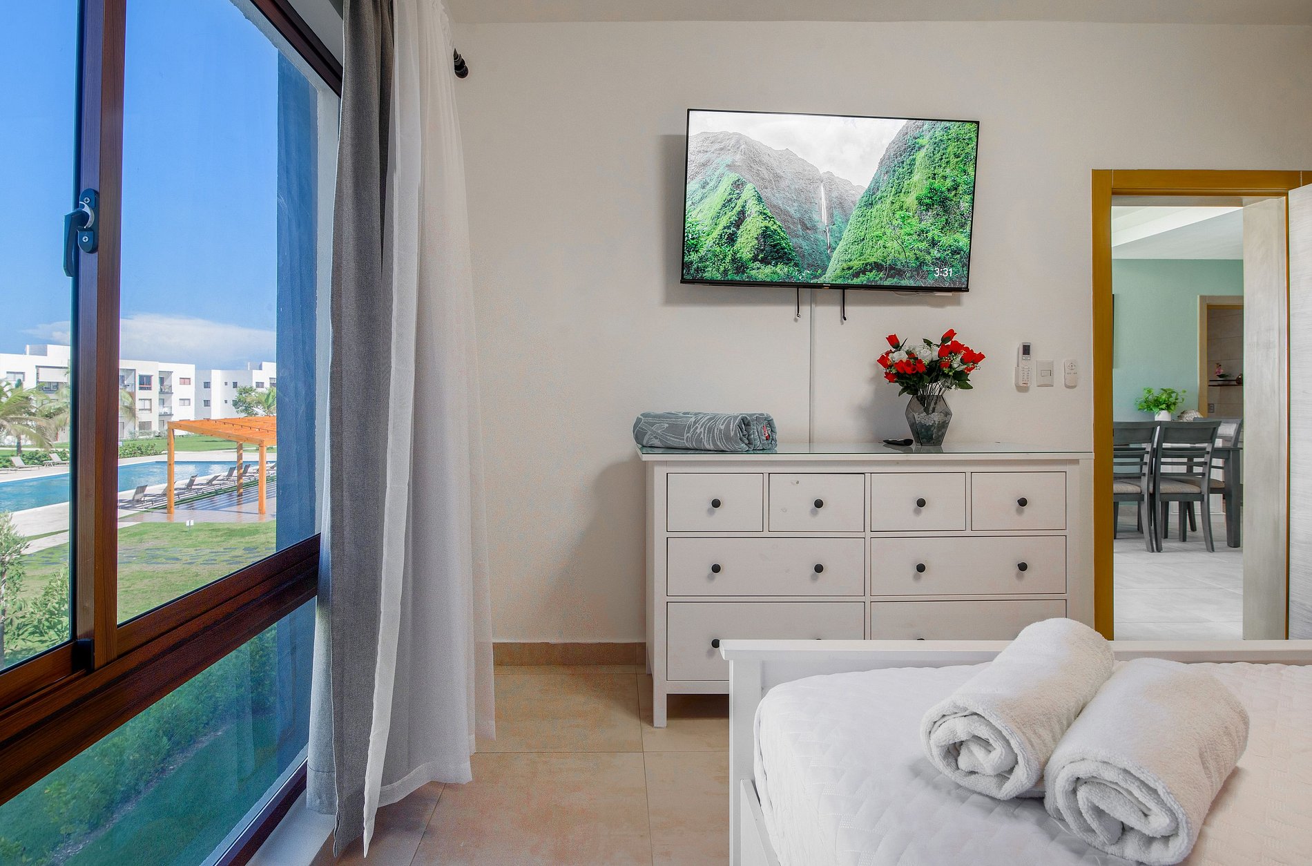 La cocina está completamente equipada, perfecta para preparar tus comidas como si estuvieras en casa. La sala ofrece un espacio ideal para relajarte, con otra smart TV para tu entretenimiento y un balcón desde el cual podrás disfrutar de las vistas directas a la piscina, perfecto para iniciar o terminar el día con serenidad. Además, la sala dispone de un medio baño para invitados, brindando mayor comodidad a tus visitas.