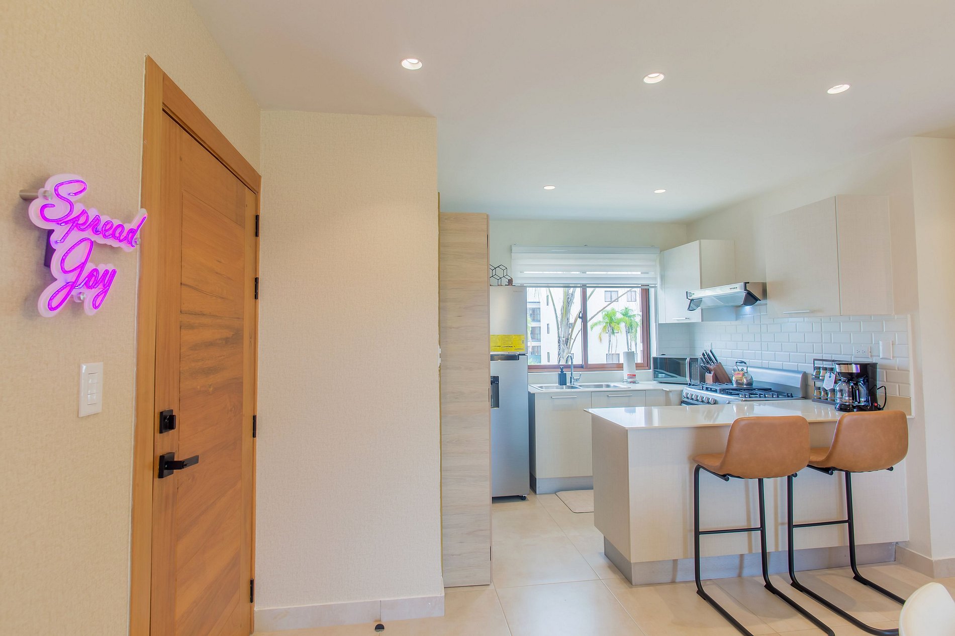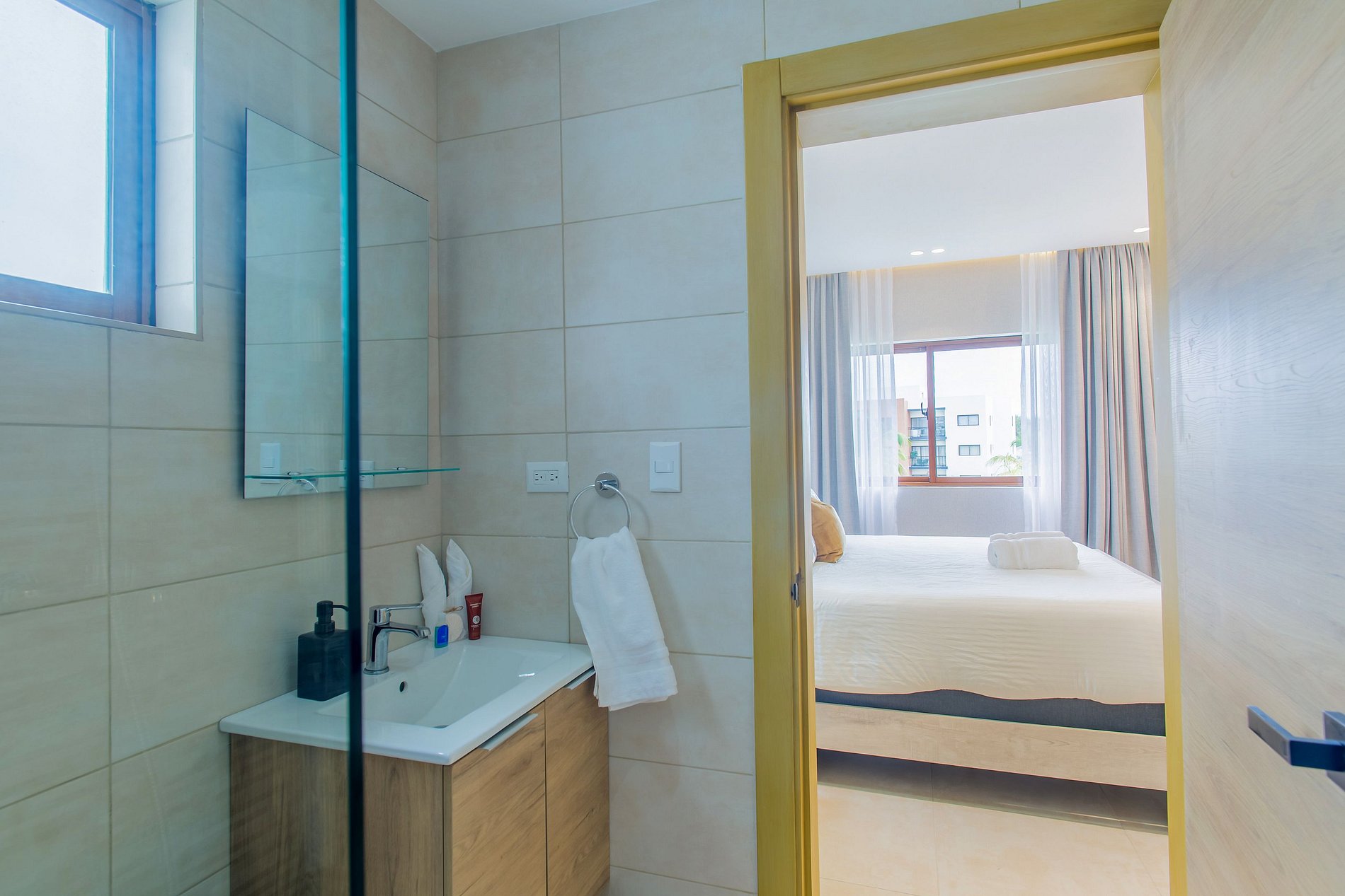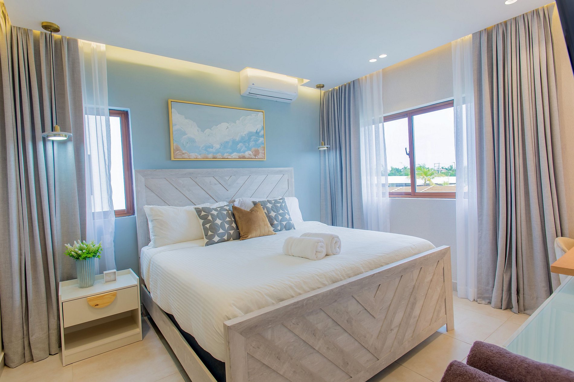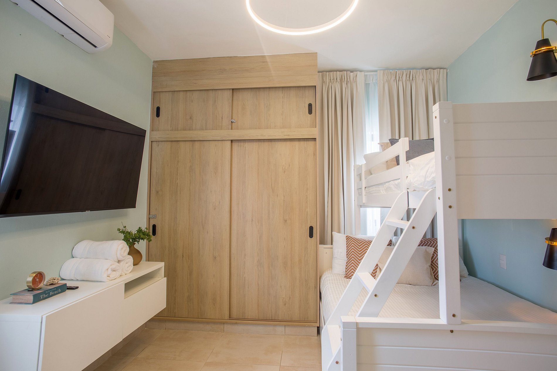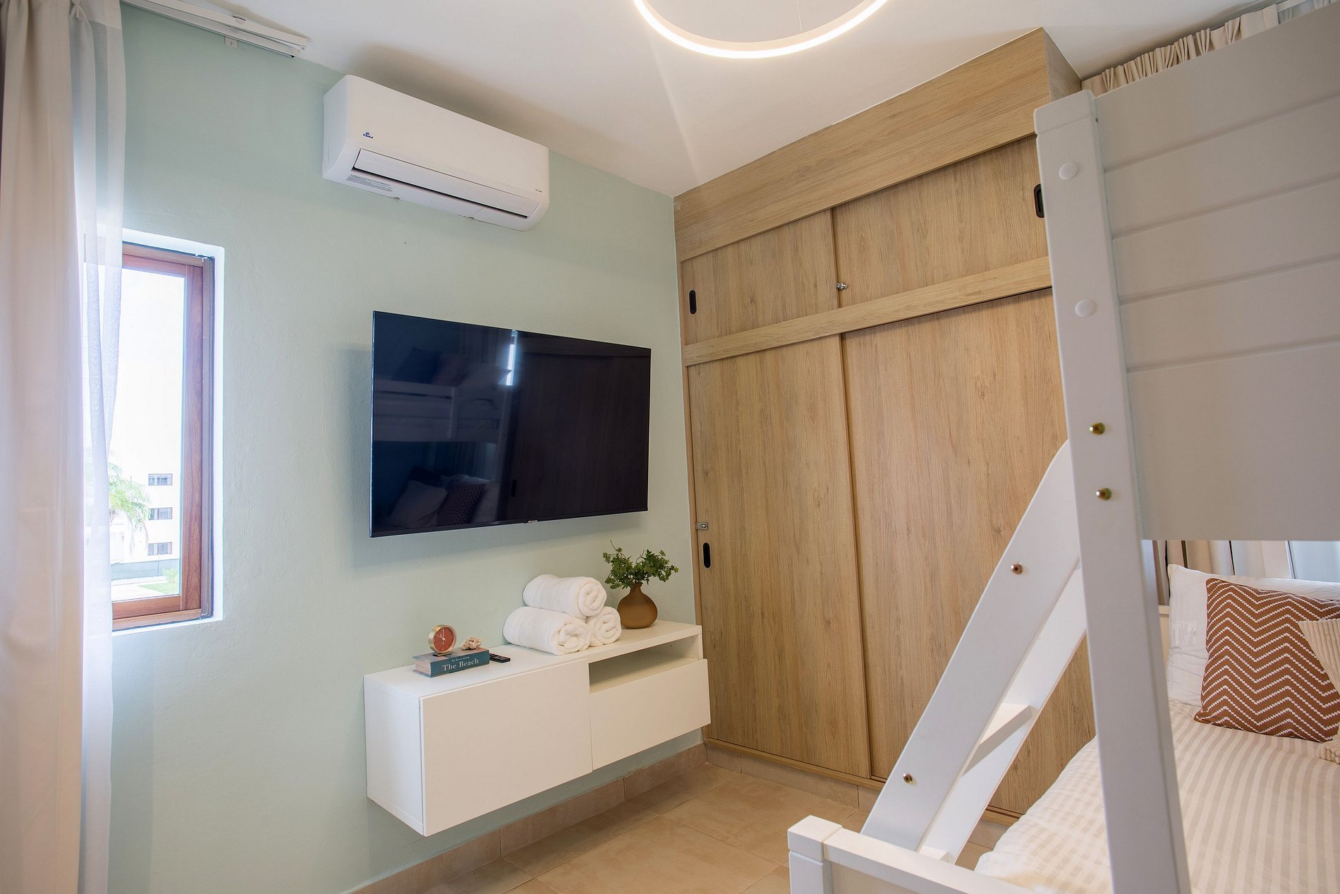 La habitación principal con una cama queen y un walk-in closet, creando el lugar ideal para descansar. La habitación secundaria, ideal para familias, ofrece una litera con un colchón queen en el nivel inferior y uno twin en el superior. Desde el balcón puedes relajarte mientras disfrutas de una hermosa vista a la piscina y al jardín.
