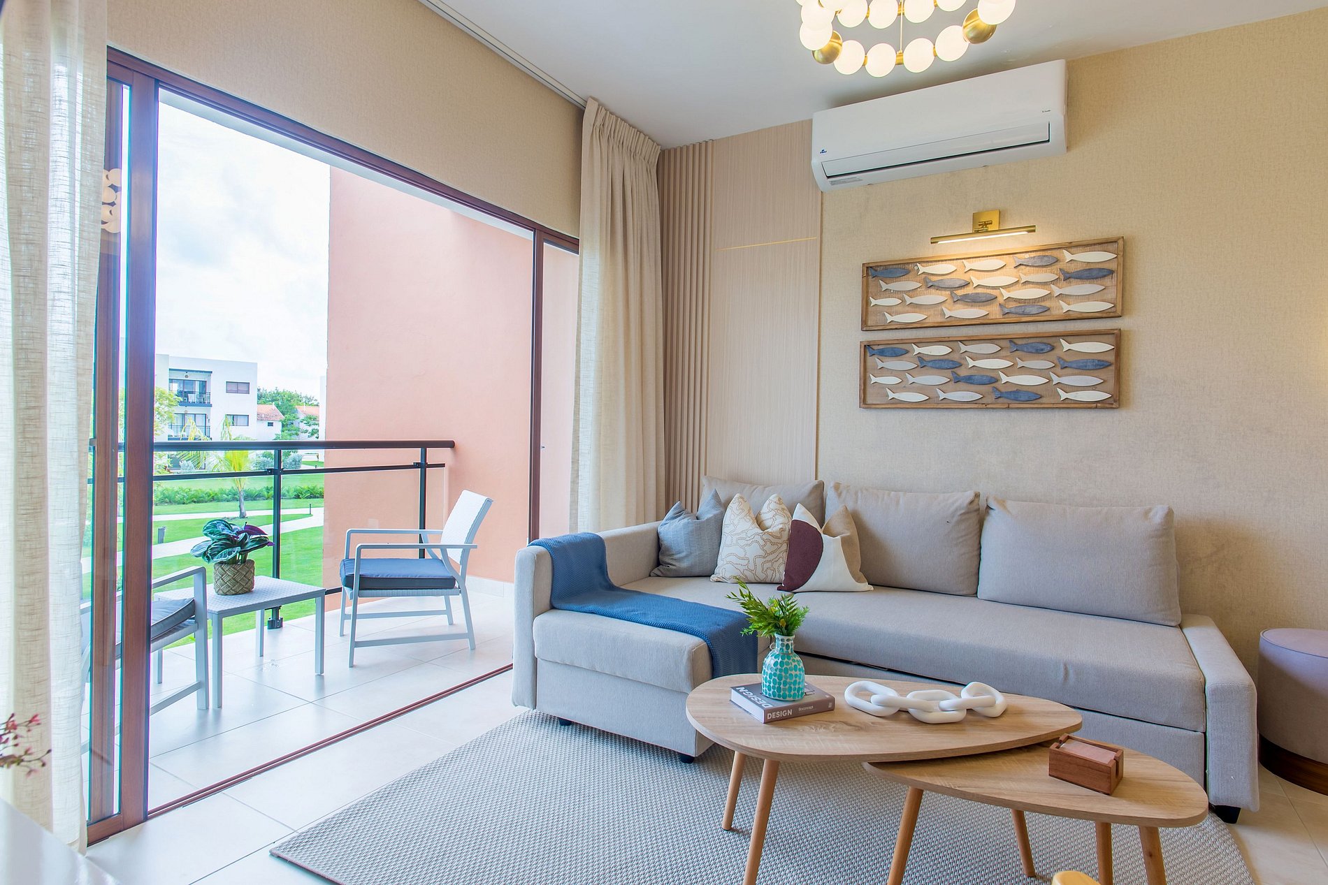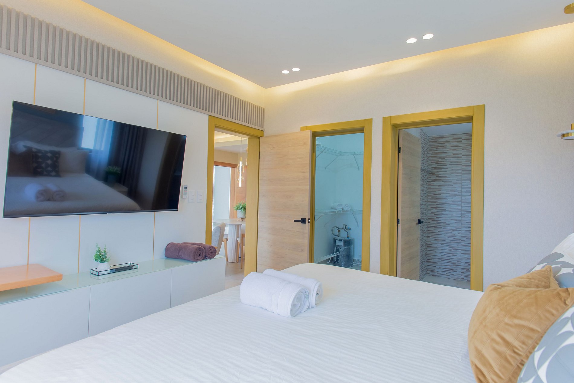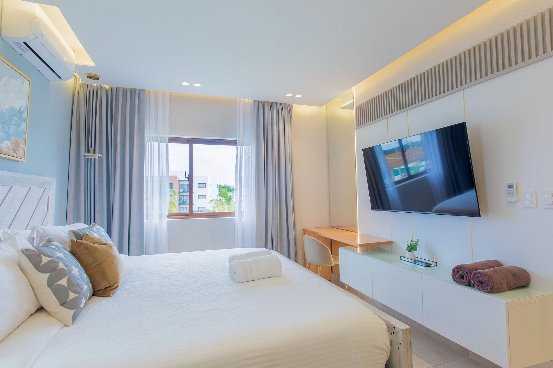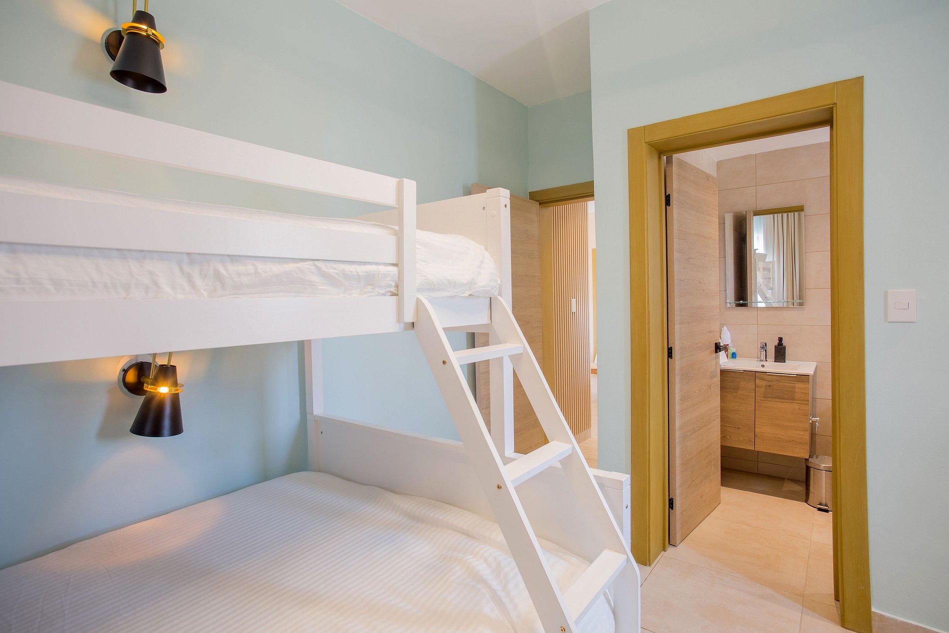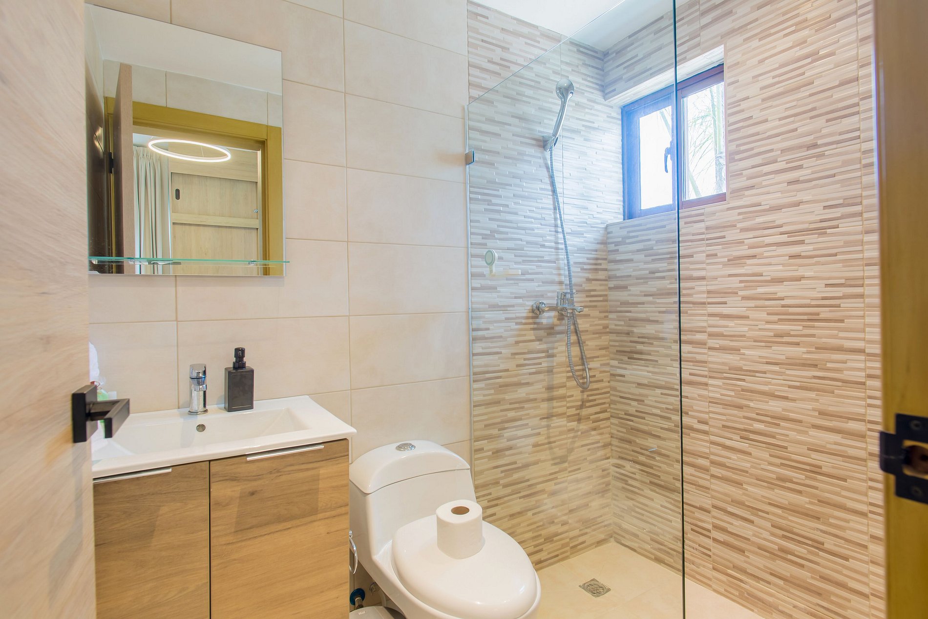 La habitación principal con una cama queen y un walk-in closet, creando el lugar ideal para descansar. La habitación secundaria, ideal para familias, ofrece una litera con un colchón queen en el nivel inferior y uno twin en el superior. Desde el balcón puedes relajarte mientras disfrutas de una hermosa vista a la piscina y al jardín.