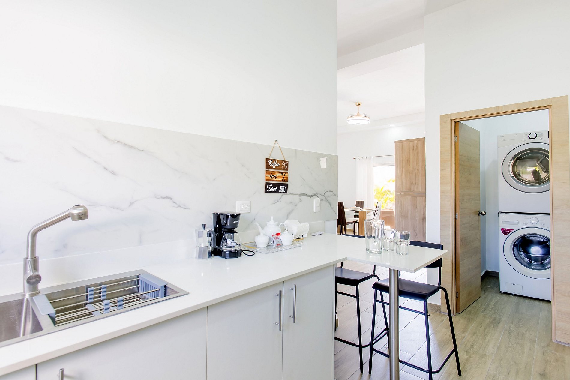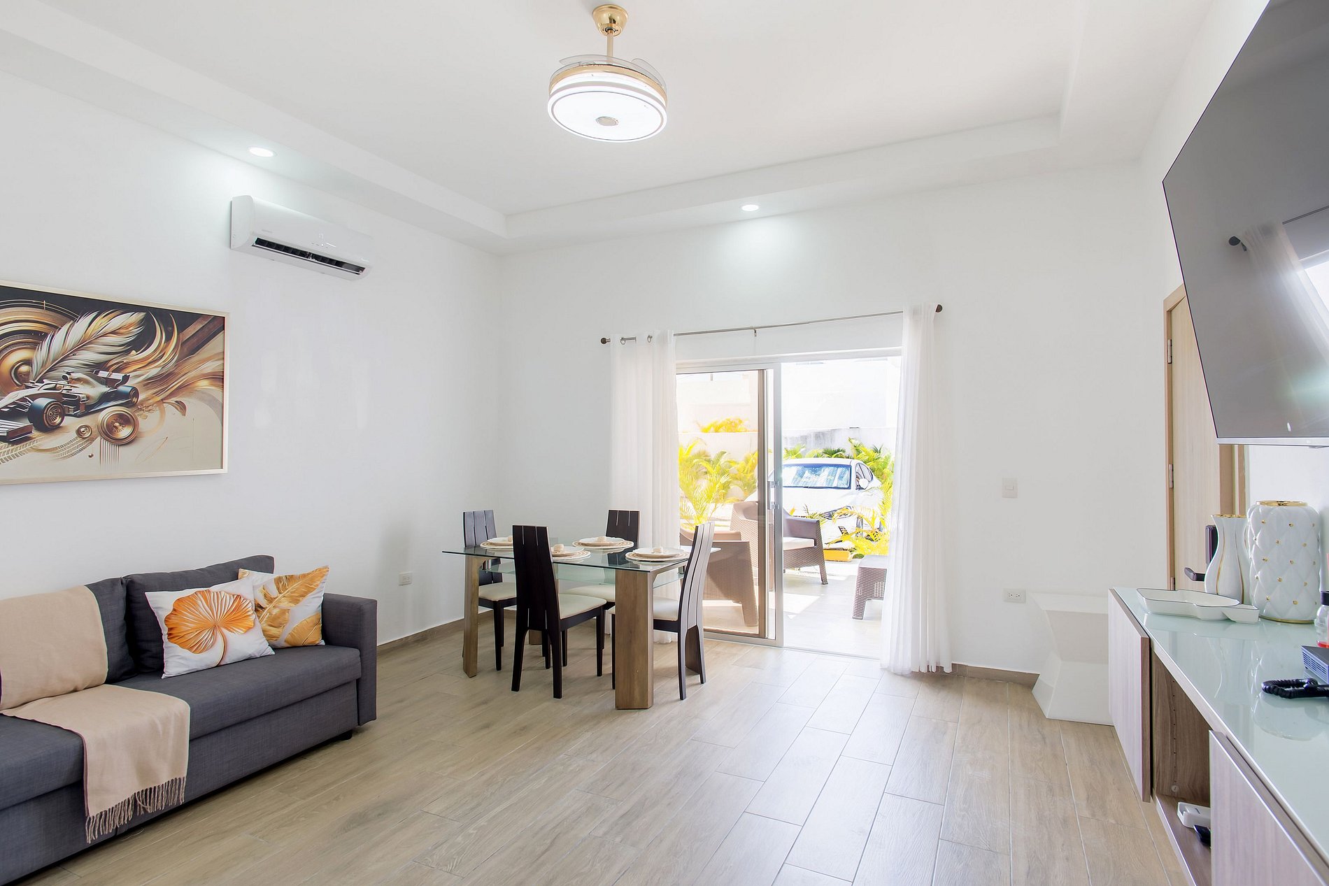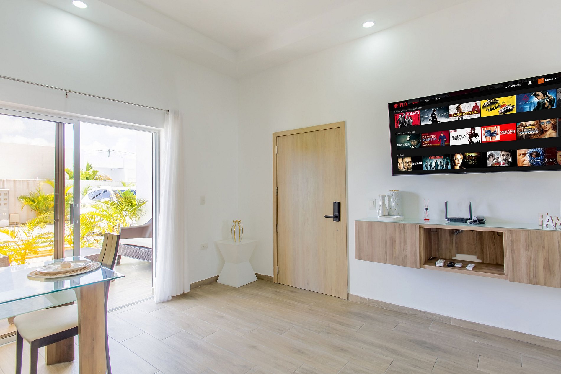 Desde que entras, sentirás la calidez y el confort de este moderno apartamento. Disfruta de una sala acogedora con sofá cama y Smart TV, ideal para relajarte. La cocina, de diseño contemporáneo, está totalmente equipada y conectada a un elegante comedor donde puedes disfrutar tus comidas con comodidad. La habitación ofrece una cama king size y otra Smart TV para tu entretenimiento. Y como toque especial, un patio privado que te brinda ese espacio extra de tranquilidad solo para ti.