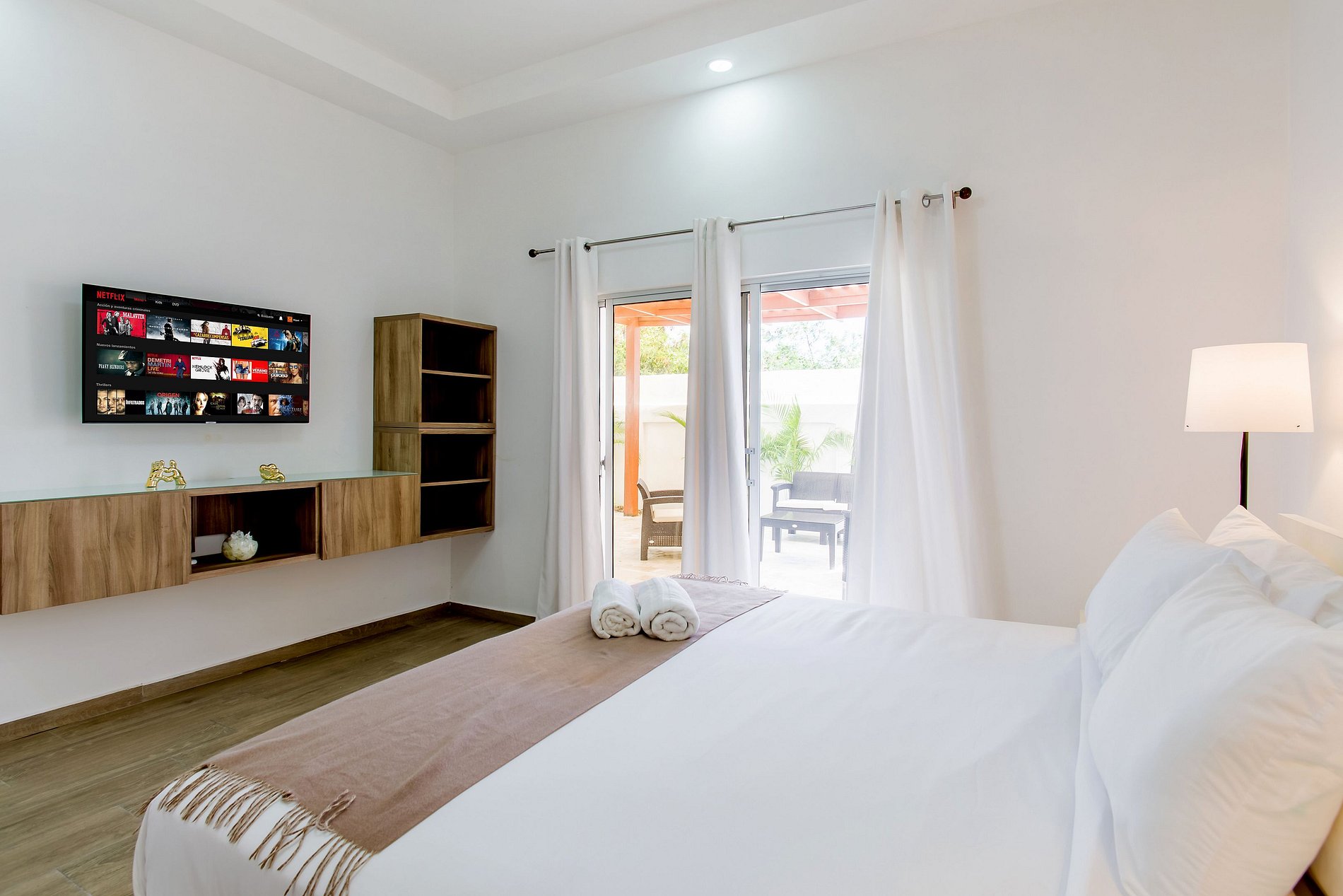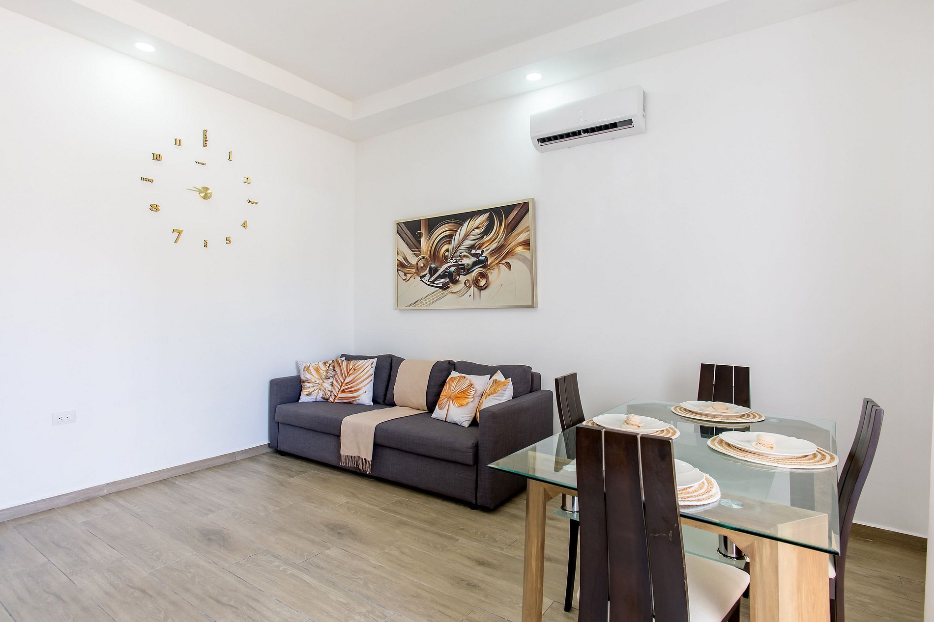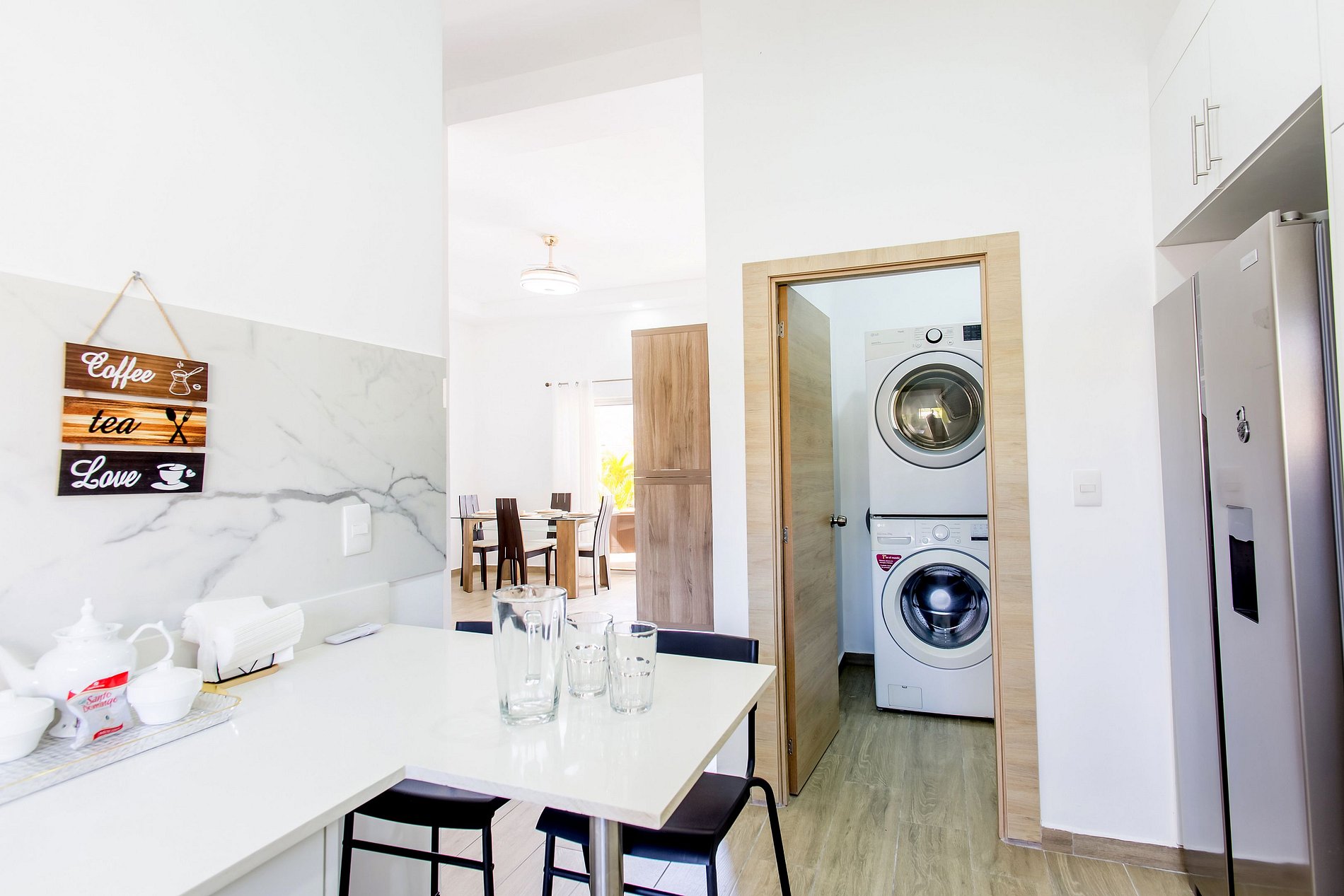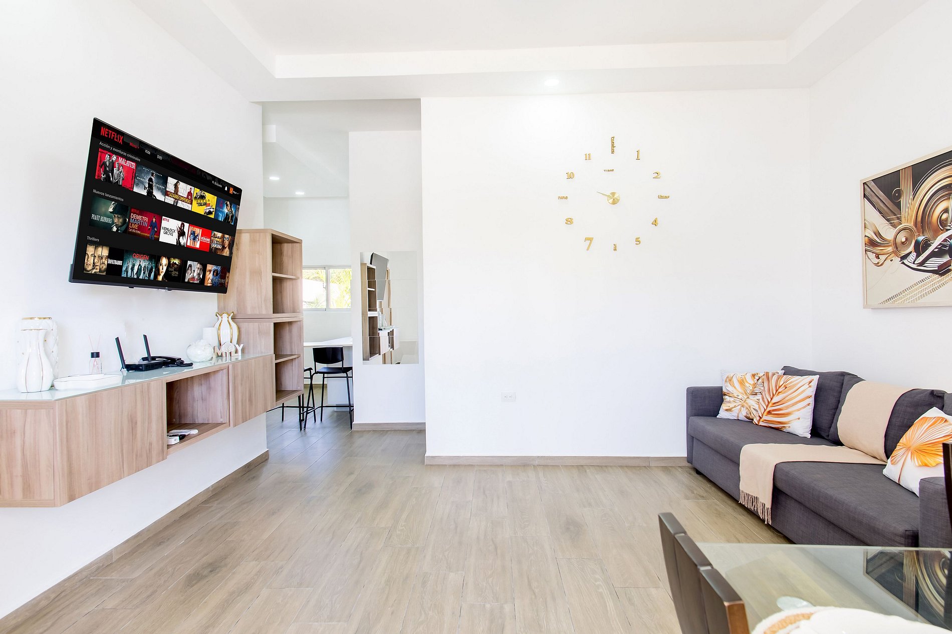 Desde que entras, sentirás la calidez y el confort de este moderno apartamento. Disfruta de una sala acogedora con sofá cama y Smart TV, ideal para relajarte. La cocina, de diseño contemporáneo, está totalmente equipada y conectada a un elegante comedor donde puedes disfrutar tus comidas con comodidad. La habitación ofrece una cama king size y otra Smart TV para tu entretenimiento. Y como toque especial, un patio privado que te brinda ese espacio extra de tranquilidad solo para ti.