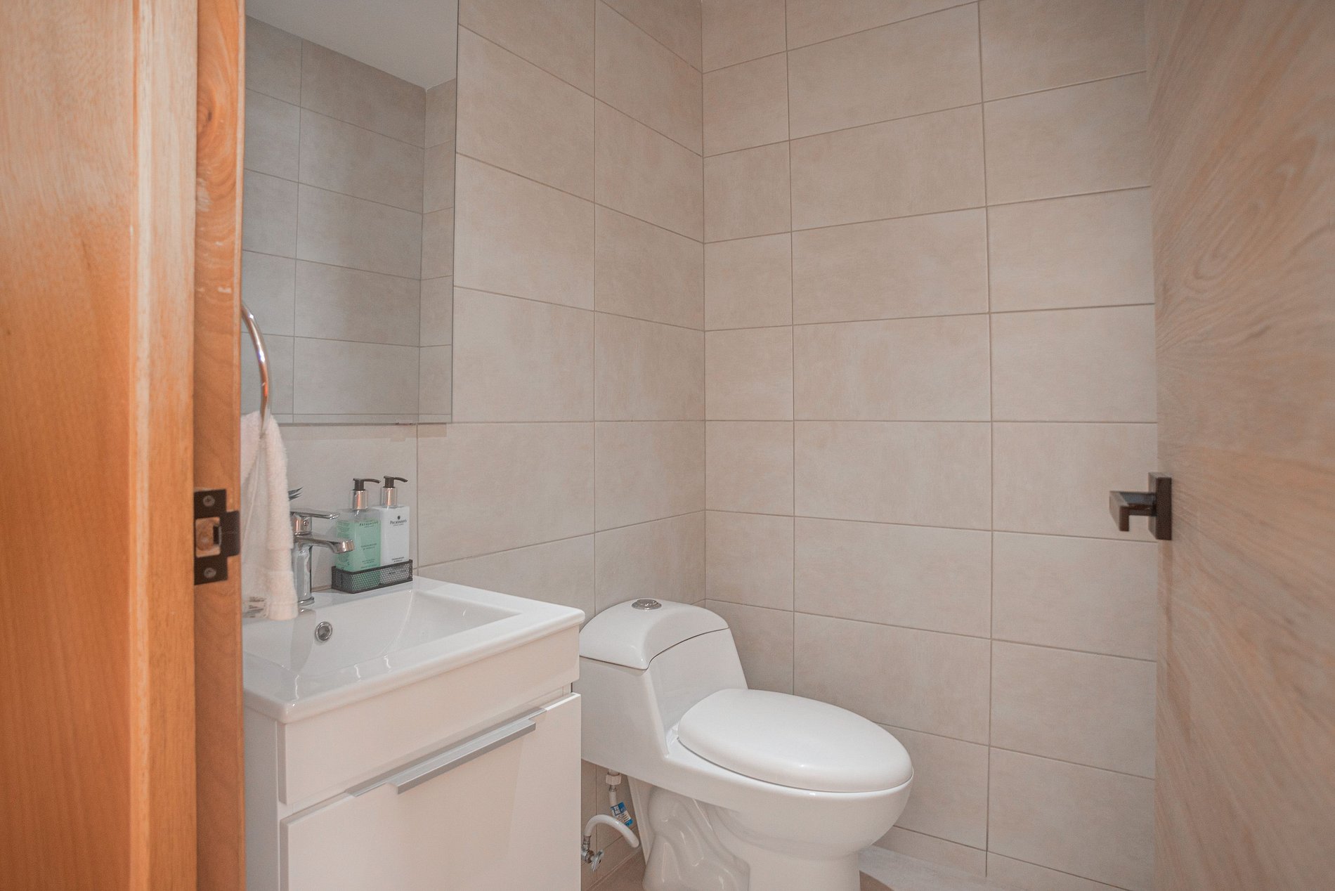 Al entrar, una acogedora sala de estar y comedor te dan la bienvenida, con un cómodo sofá cama y una Smart TV para entretenimiento y para que puedas disfrutar tus series y peliculas favoritas cómodamente. La cocina moderna está totalmente equipada. En la sala, encontrarás un medio baño para tu comodidad.