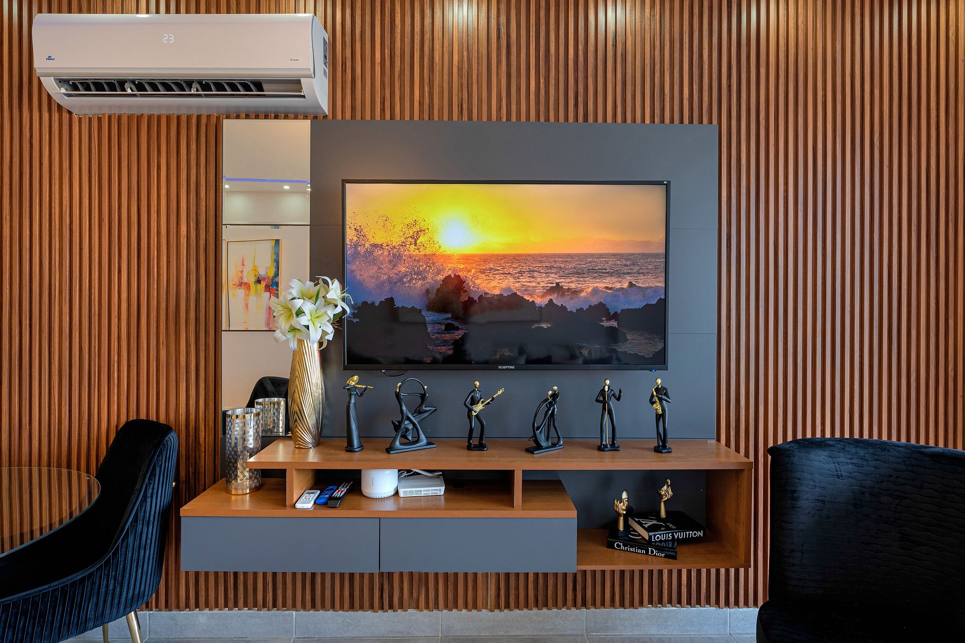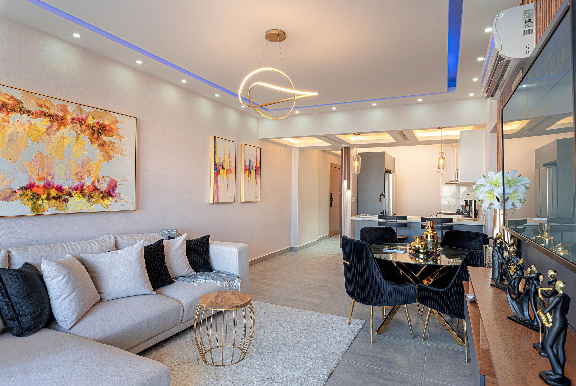 Al abrir la puerta del apartamento 'Home Away from Home', te encuentras con un espacio acogedor y sofisticado. La sala de estar te da la bienvenida con su televisión Smart TV. El elegante sofá invita a sumergirse en su comodidad y a relajarse mientras disfrutas de una tarde de películas o series.