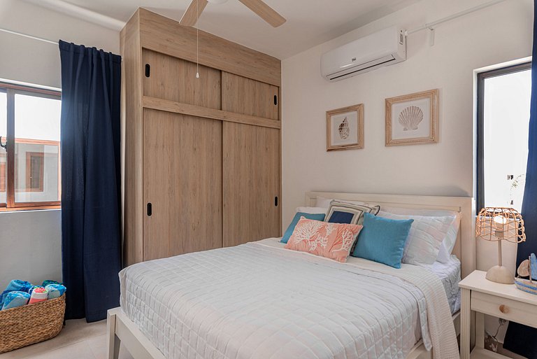 La habitación principal ofrece una cama King Size para sueños rejuvenecedores y un amplio walking closet, mientras que la habitación secundaria cuenta con una cómoda cama Queen. La sala te invita a relajarte en un sofá y disfrutar de entretenimiento en la Smart TV. El comedor de 4 sillas es perfecto para compartir momentos especiales.