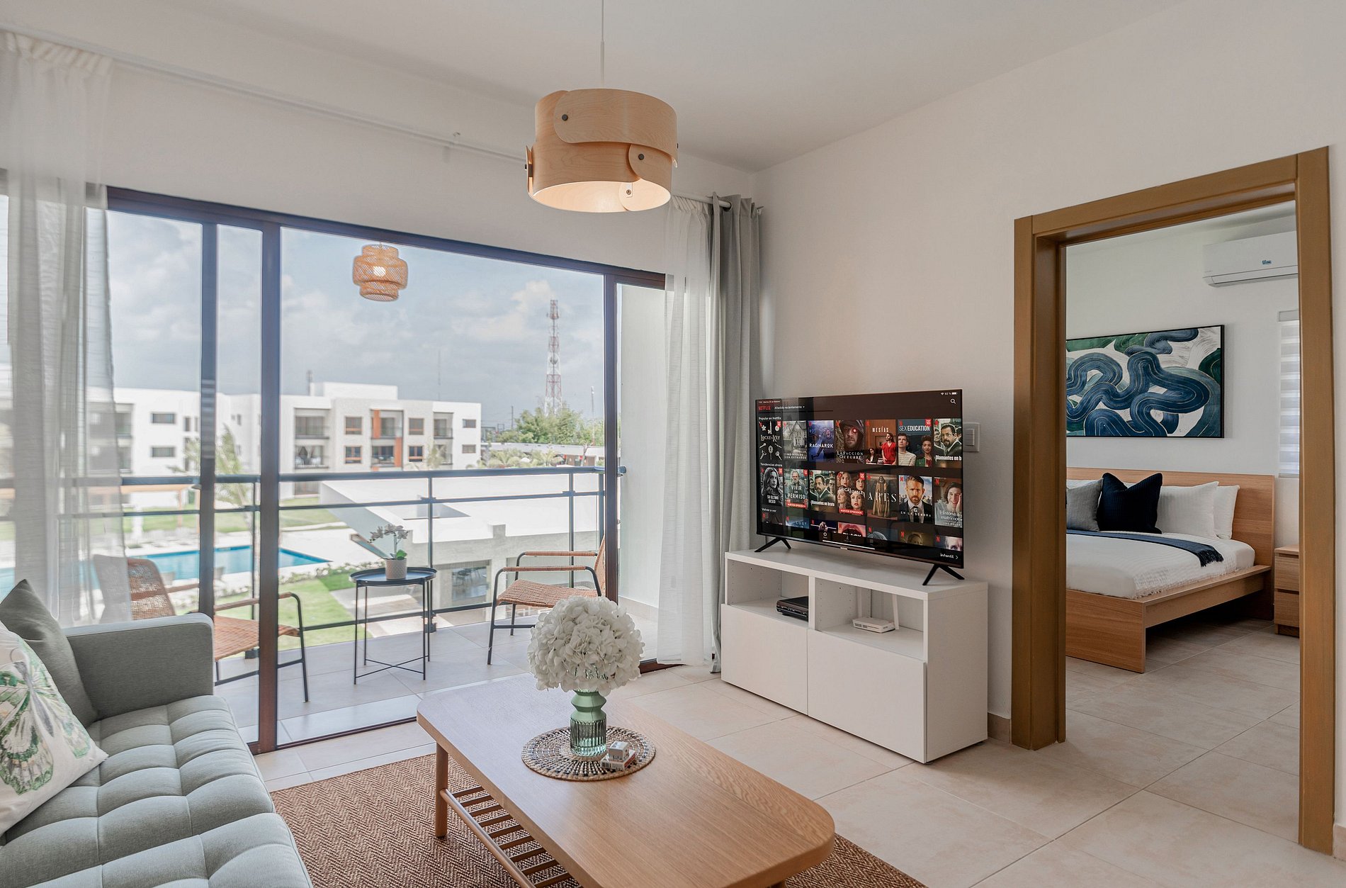 Abre las puertas al balcón y déjate seducir por la vista panorámica a la piscina.